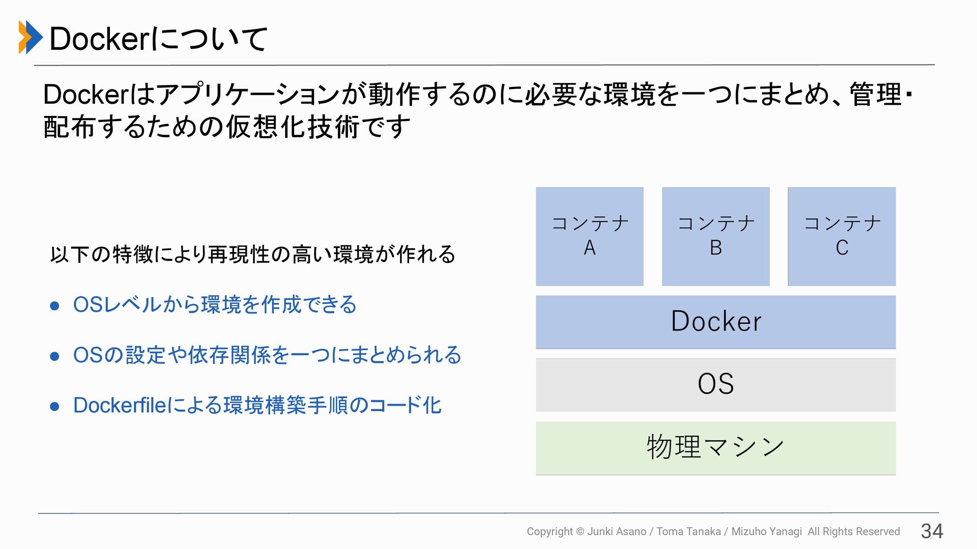 All Rights Reserved 34 Dockerについて Dockerはアプリケーションが動作するのに必要な環境を一つにまとめ、管理・ 配布するための仮想化技術です 以下の特徴により再現性の高い環境が作れる • OSレベルから環境を作成できる • OSの設定や依存関係を一つにまとめられる • Dockerfileによる環境構築手順のコード化