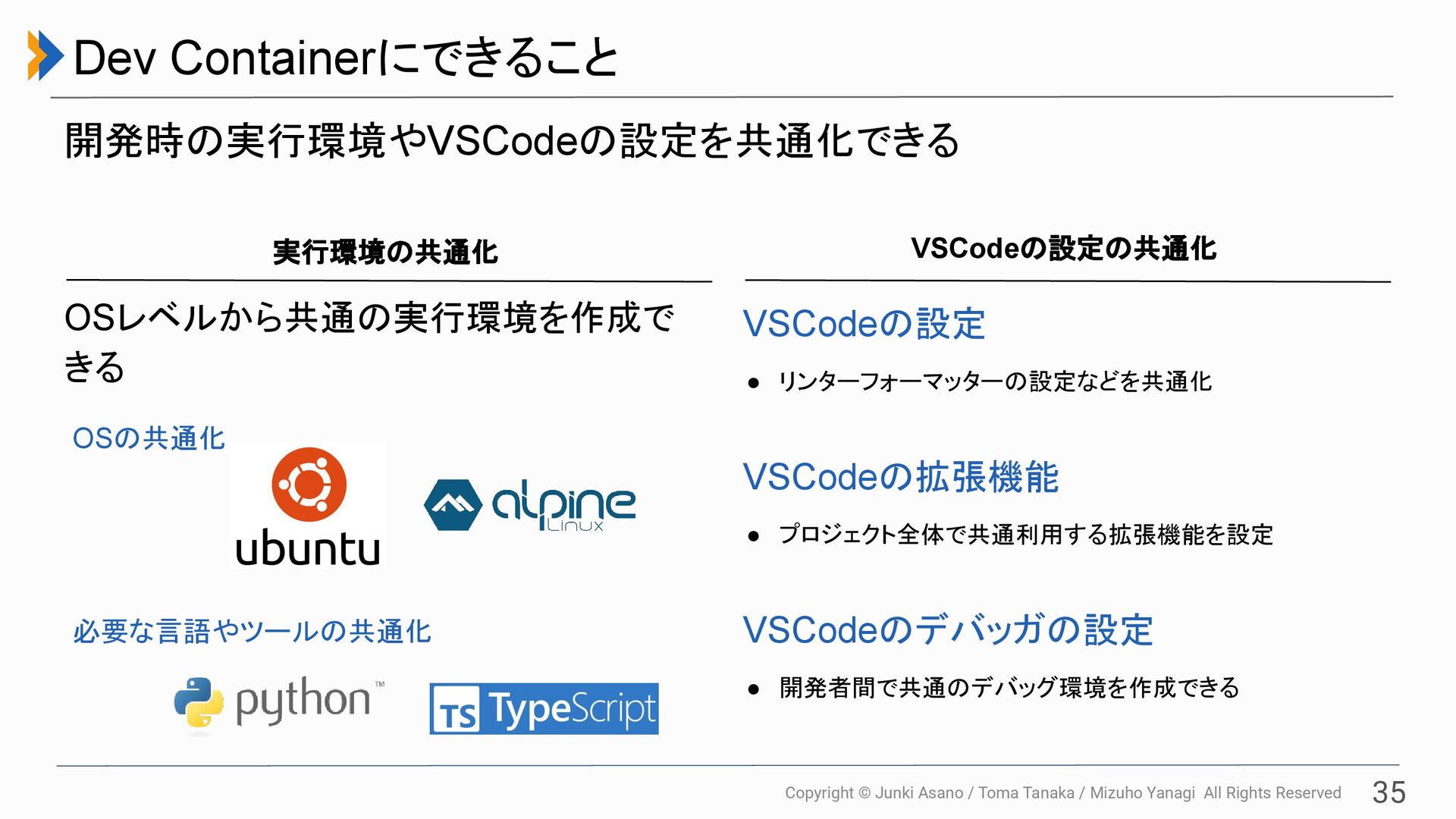 All Rights Reserved 33 Dev Container Dev ContainerとはVS Codeの拡張機能であり、Dockerコンテナを使って開発 環境を構築する仕組みです