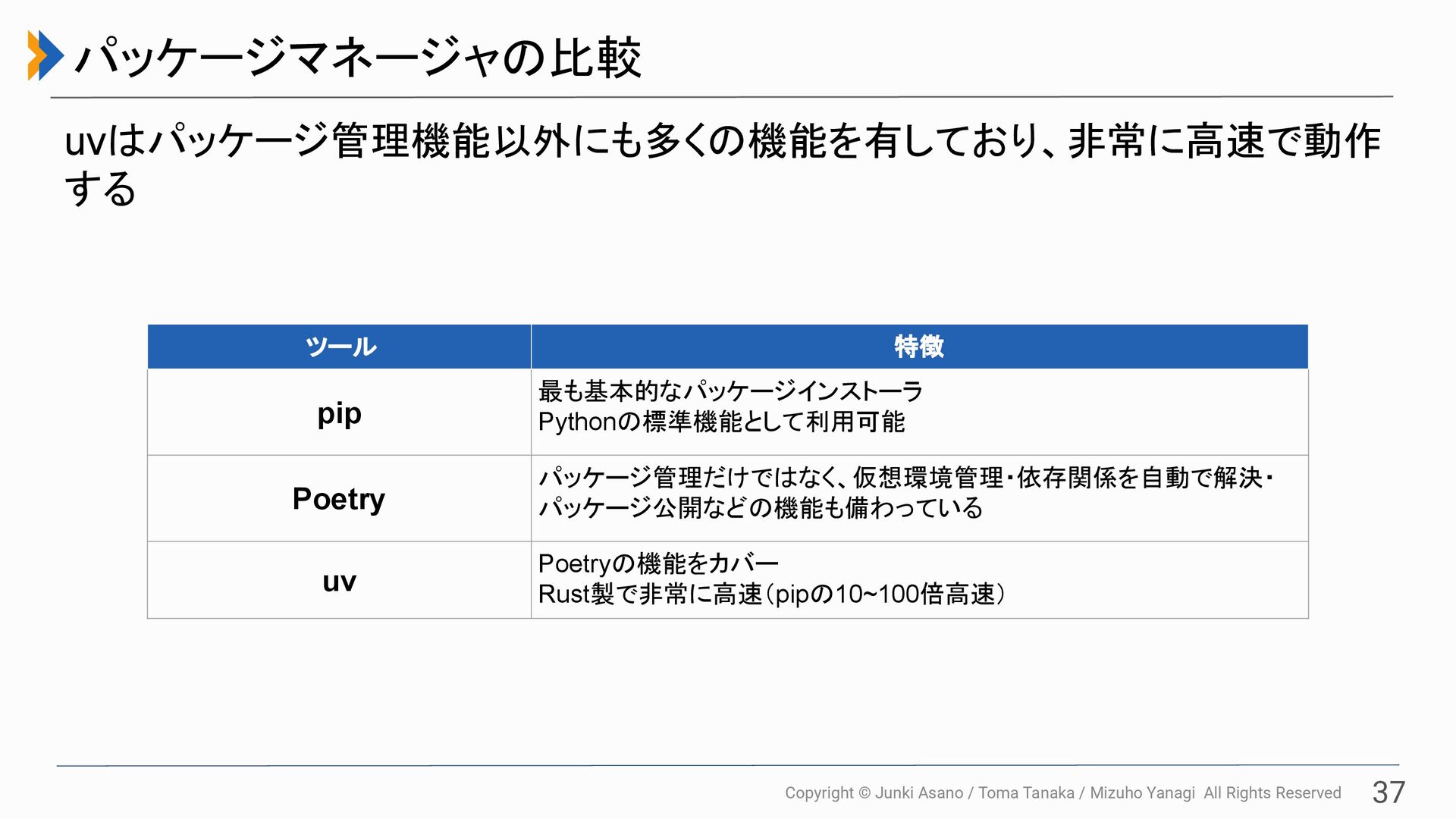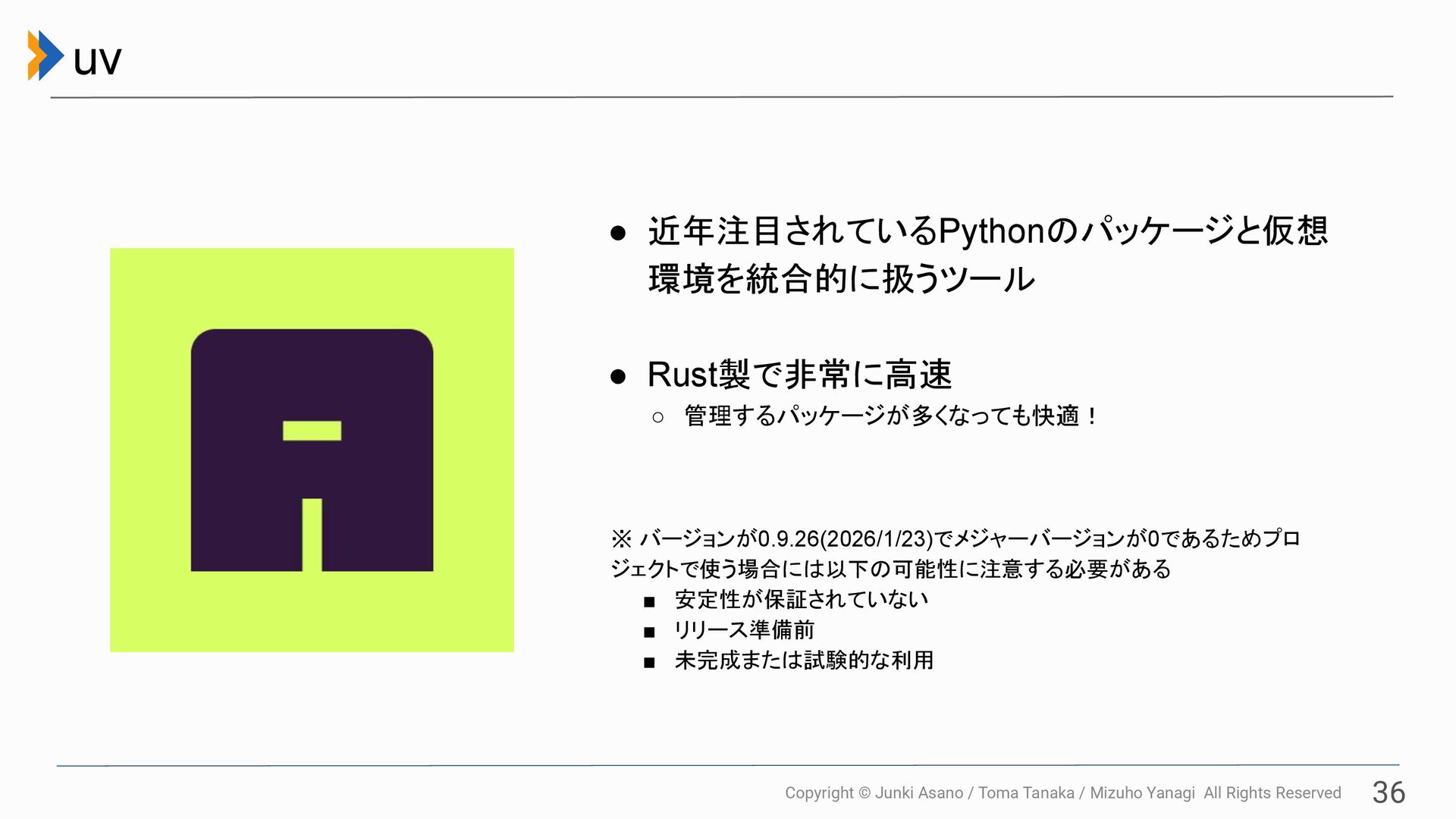 All Rights Reserved 36 uv • 近年注目されているPythonのパッケージと仮想 環境を統合的に扱うツール • Rust製で非常に高速 ◦ 管理するパッケージが多くなっても快適!