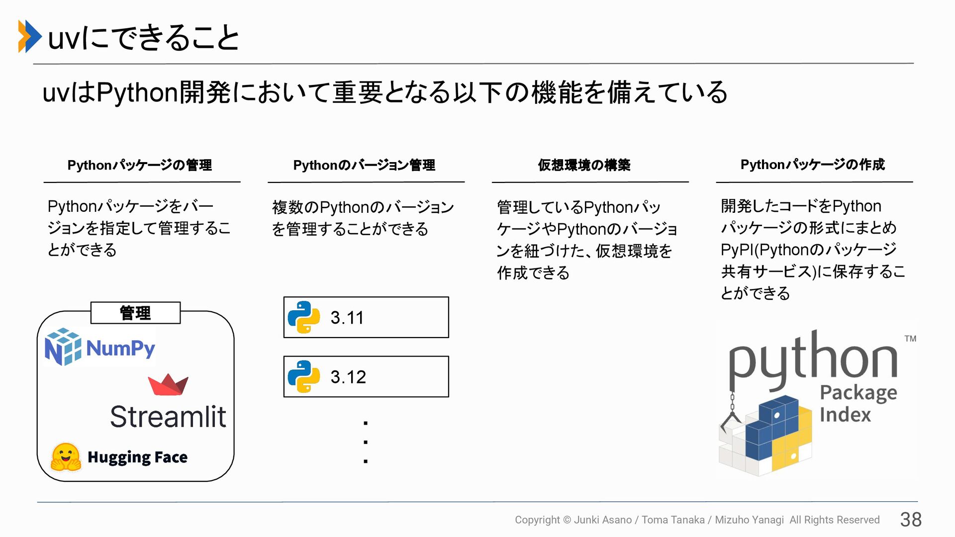 All Rights Reserved 37 パッケージマネージャの比較 uvはパッケージ管理機能以外にも多くの機能を有しており、非常に高速で動作 する ツール 特徴 pip 最も基本的なパッケージインストーラ Pythonの標準機能として利用可能 Poetry パッケージ管理だけではなく、仮想環境管理・依存関係を自動で解決・ パッケージ公開などの機能も備わっている uv Poetryの機能をカバー Rust製で非常に高速(pipの10~100倍高速) ※ uvはバージョンが0.9.27(2026/1/27)でメジャーバージョンが0であるためプロジェクトで使う場合には以下の可能性に注意する必要があります。 ▪ 安定性が保証されていない ▪ リリース準備前 ▪ 未完成または試験的な利用