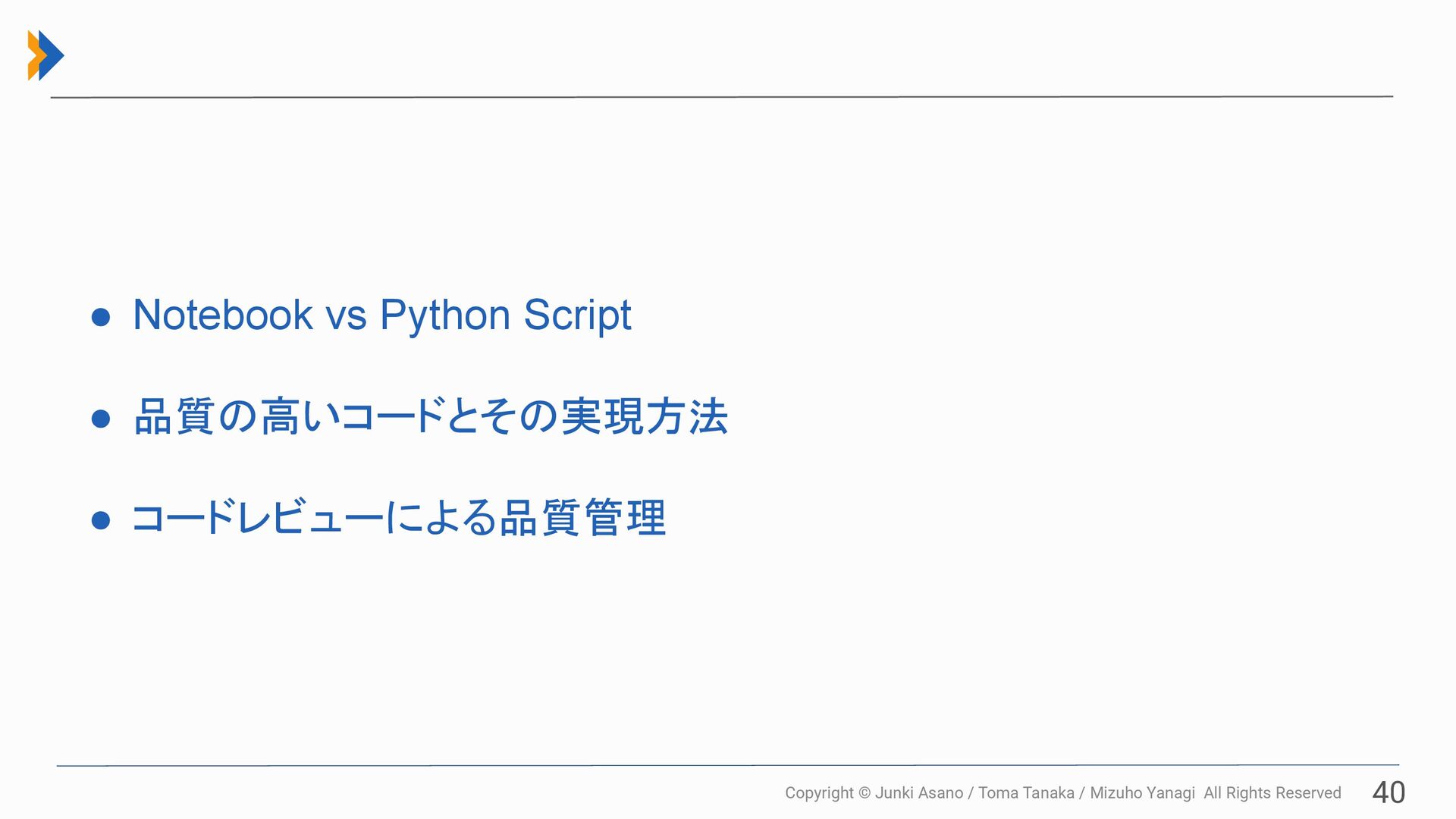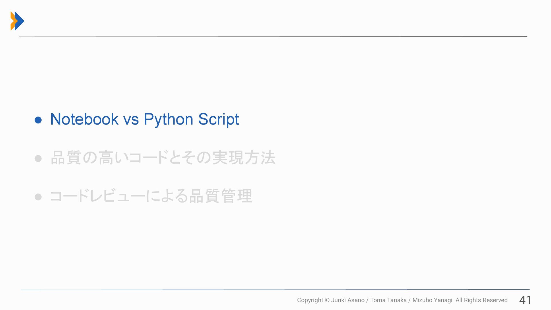 All Rights Reserved 40 • Notebook vs Python Script • 品質の高いコードとその実現方法 • コードレビューによる品質管理
