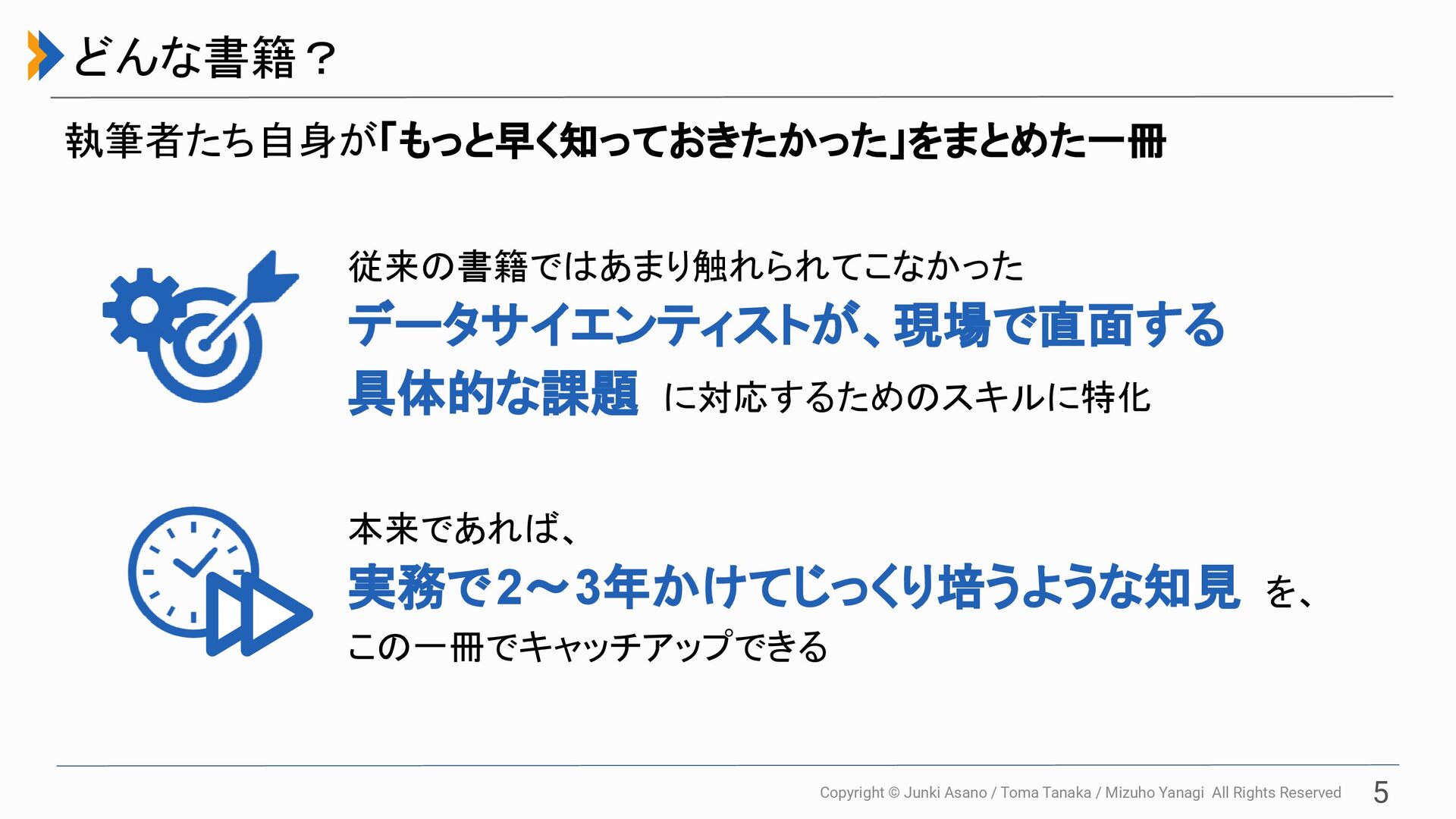All Rights Reserved 本発表について 4 本発表を通して、書籍の概要を掴む ことができる ※ 詳細な解説とハンズオンで学ぶには、ぜひ書籍をお買い求めください! データサイエンティストが 実務で求められるエンジニアリングスキル を、 書籍の内容をもとに執筆者本人が解説 お伝えすること ご利益