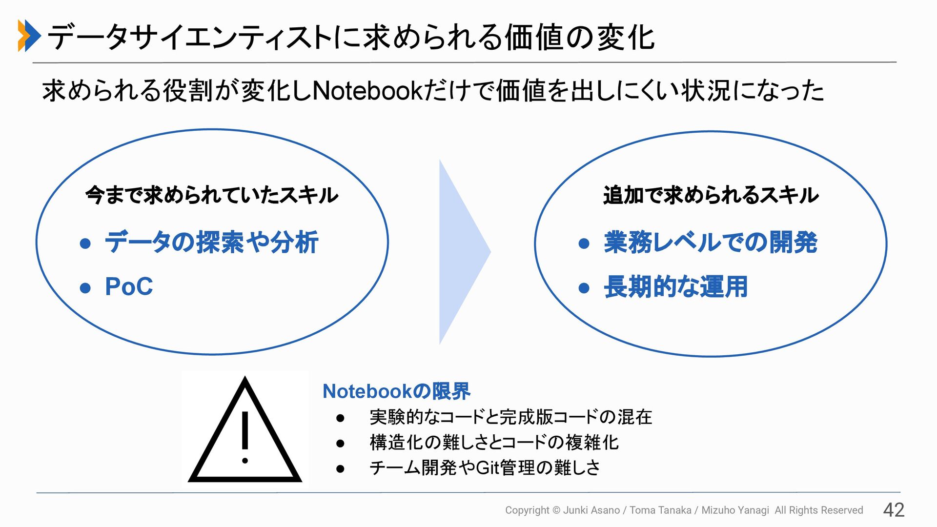 All Rights Reserved 42 データサイエンティストに求められる価値の変化 求められる役割が変化しNotebookだけで価値を出しにくい状況になった Notebookの限界 • 実験的なコードと完成版コードの混在 • 構造化の難しさとコードの複雑化 • チーム開発やGit管理の難しさ • データの探索や分析 • PoC • 業務レベルでの開発 • 長期的な運用 今まで求められていたスキル 追加で求められるスキル