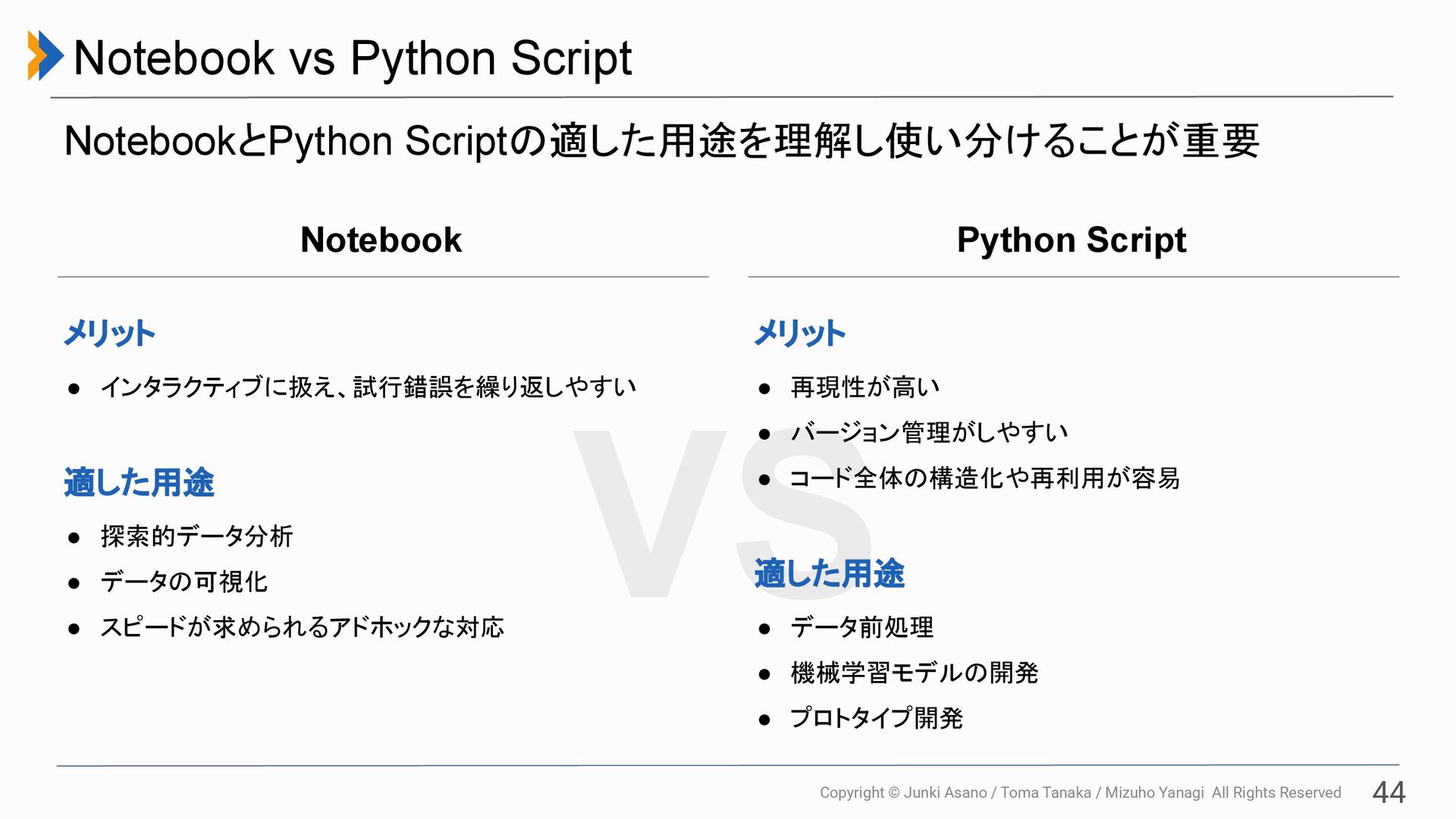 All Rights Reserved 44 Notebook vs Python Script NotebookとPython Scriptの適した用途を理解し使い分けることが重要 VS メリット • インタラクティブに扱え、試行錯誤を繰り返しやすい 適した用途 • 探索的データ分析 • データの可視化 • スピードが求められるアドホックな対応 Notebook メリット • 再現性が高い • バージョン管理がしやすい • コード全体の構造化や再利用が容易 適した用途 • データ前処理 • 機械学習モデルの開発 • プロトタイプ開発 Python Script