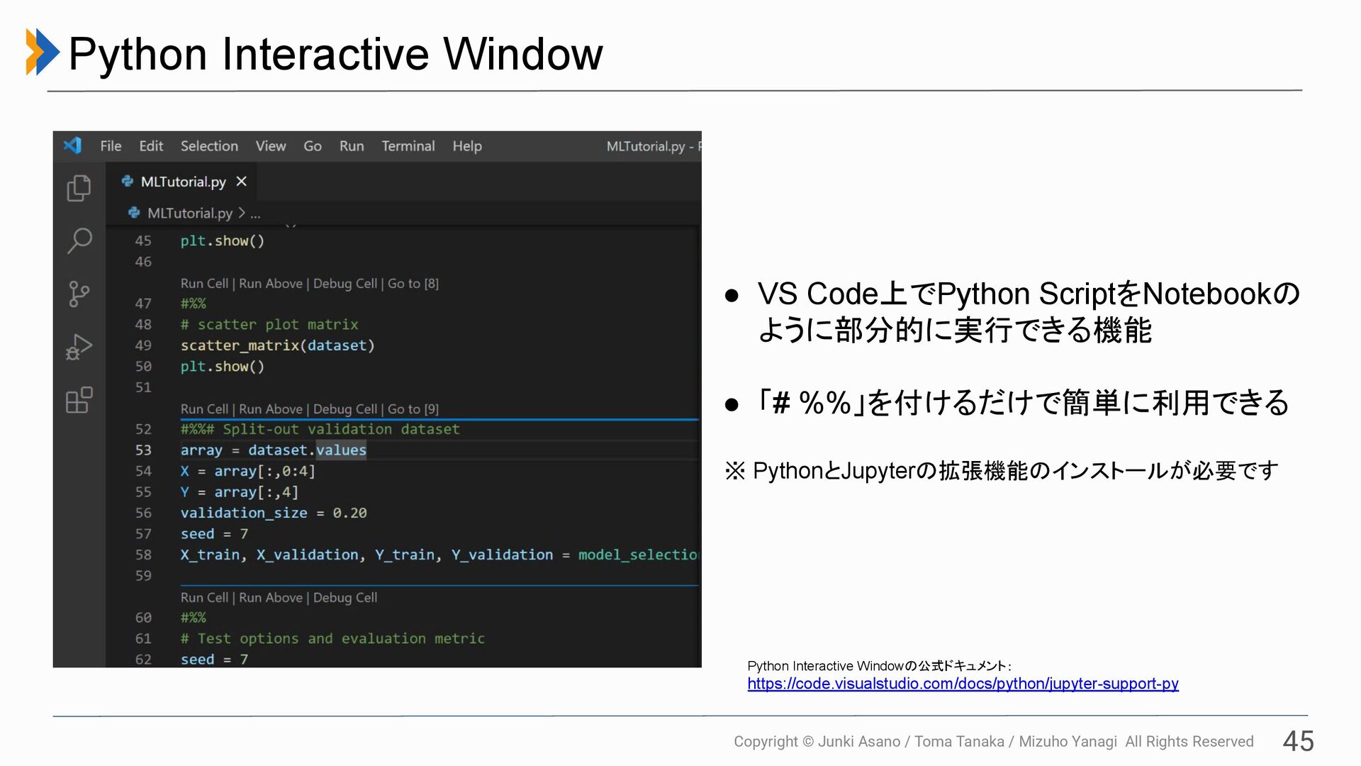 All Rights Reserved 45 Python Interactive Window Python Interactive Windowの公式ドキュメント: https://code.visualstudio.com/docs/python/jupyter-support-py • VS Code上でPython ScriptをNotebookの ように部分的に実行できる機能 • 「# %%」を付けるだけで簡単に利用できる ※ PythonとJupyterの拡張機能のインストールが必要です