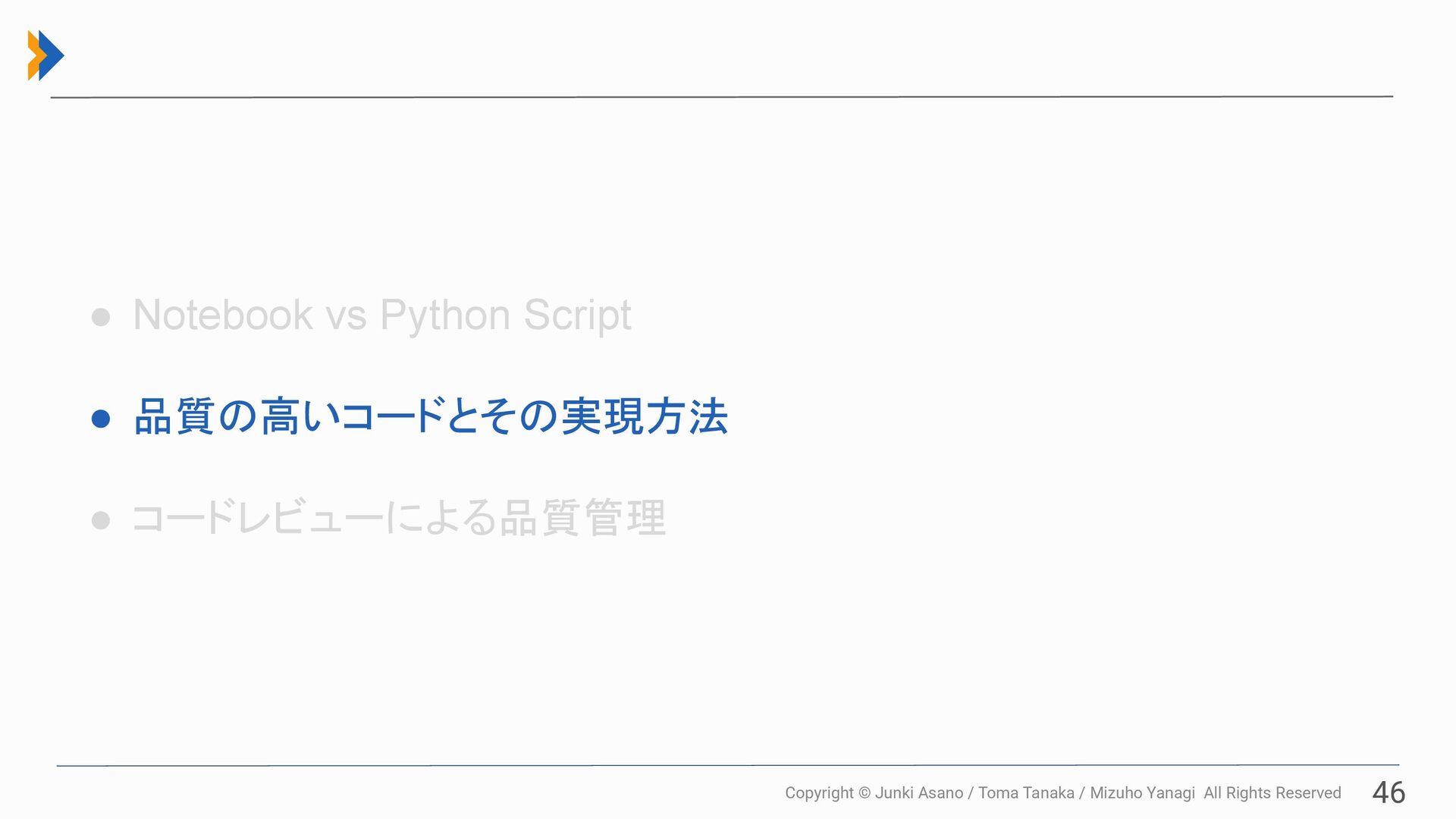 All Rights Reserved 46 • Notebook vs Python Script • 品質の高いコードとその実現方法 • コードレビューによる品質管理