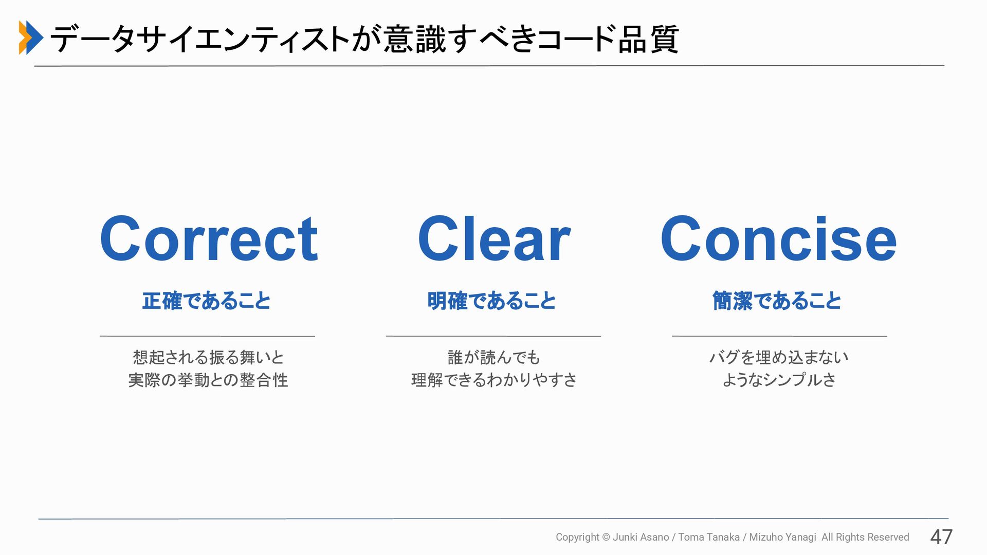 All Rights Reserved 47 データサイエンティストが意識すべきコード品質 Correct Clear Concise 正確であること 明確であること 簡潔であること 想起される振る舞いと 実際の挙動との整合性 誰が読んでも 理解できるわかりやすさ バグを埋め込まない ようなシンプルさ