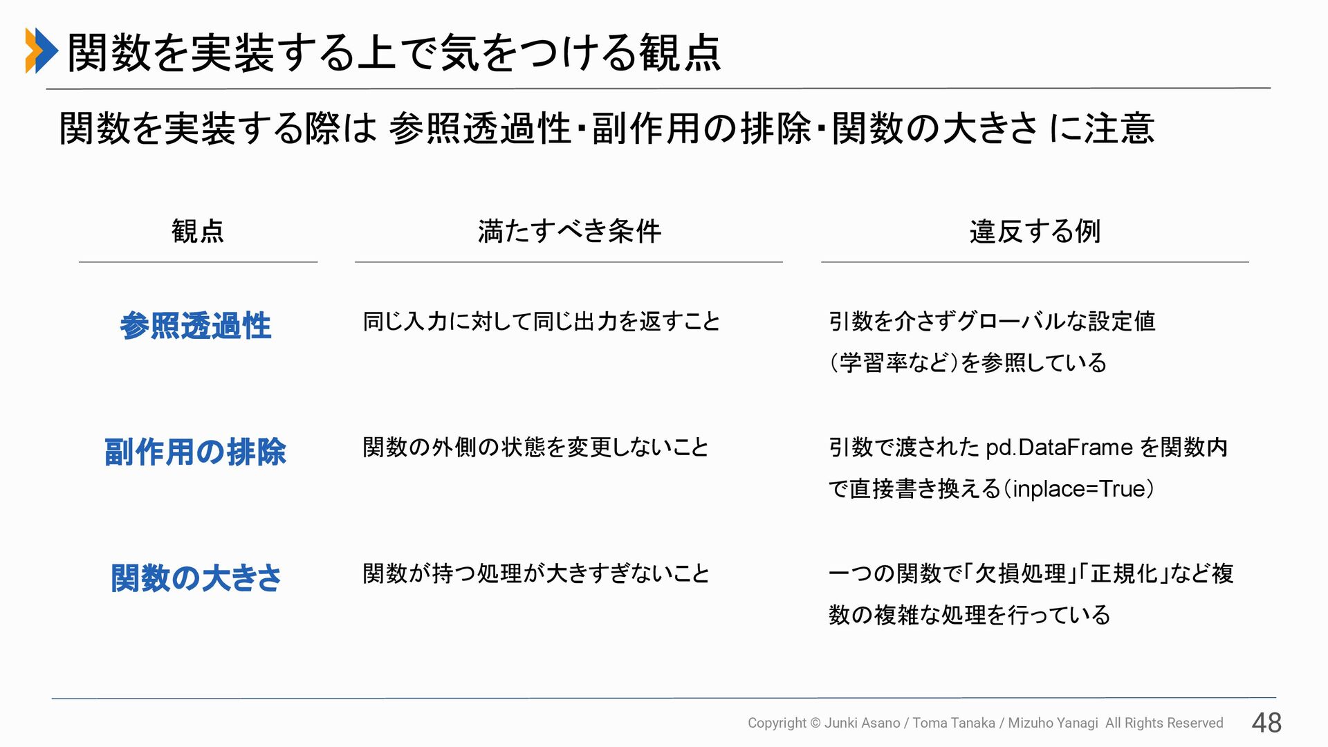 All Rights Reserved 48 関数を実装する上で気をつける観点 関数を実装する際は 参照透過性・副作用の排除・関数の大きさ に注意 観点 満たすべき条件 違反する例 参照透過性 同じ入力に対して同じ出力を返すこと 引数を介さずグローバルな設定値 (学習率など)を参照している 副作用の排除 関数の外側の状態を変更しないこと 引数で渡された pd.DataFrame を関数内 で直接書き換える(inplace=True) 関数の大きさ 関数が持つ処理が大きすぎないこと 一つの関数で「欠損処理」「正規化」など複 数の複雑な処理を行っている