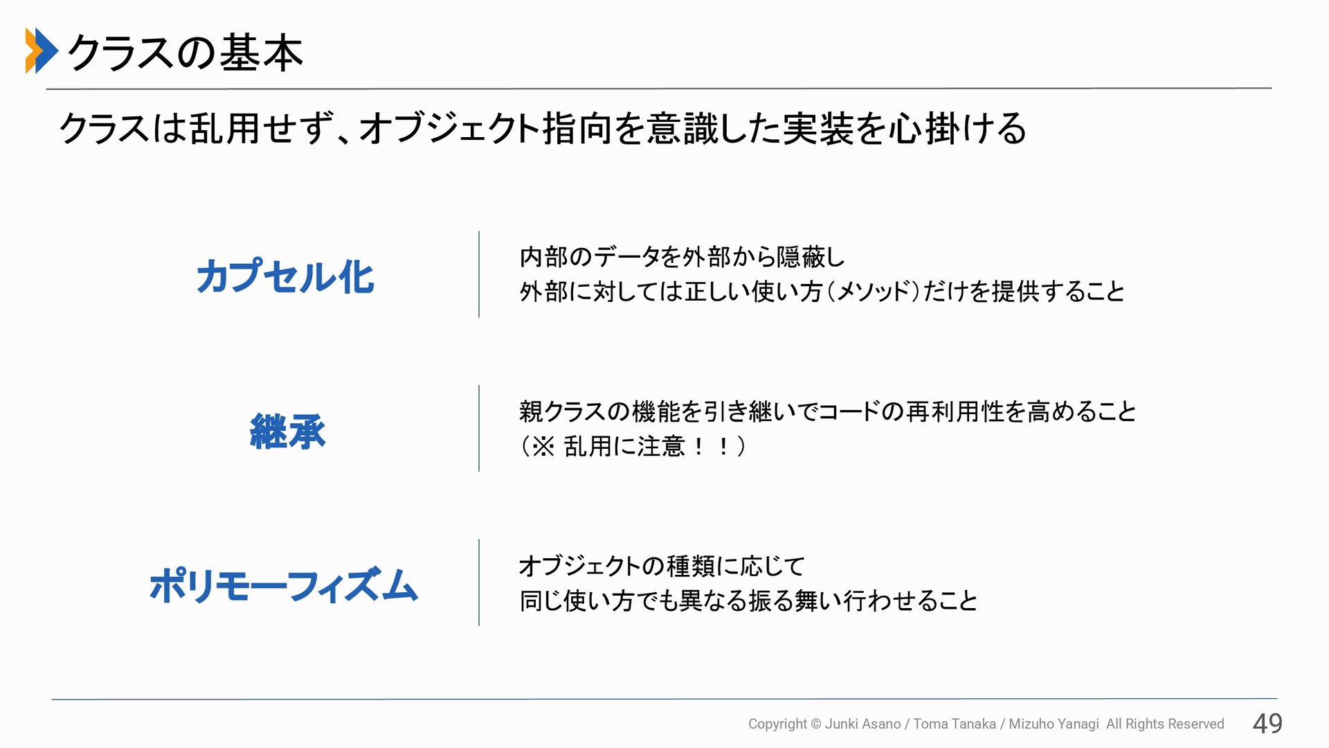 All Rights Reserved 49 クラスの基本 クラスは乱用せず、オブジェクト指向を意識した実装を心掛ける カプセル化 内部のデータを外部から隠蔽し 外部に対しては正しい使い方(メソッド)だけを提供すること 継承 親クラスの機能を引き継いでコードの再利用性を高めること (※ 乱用に注意!!) ポリモーフィズム オブジェクトの種類に応じて 同じ使い方でも異なる振る舞い行わせること