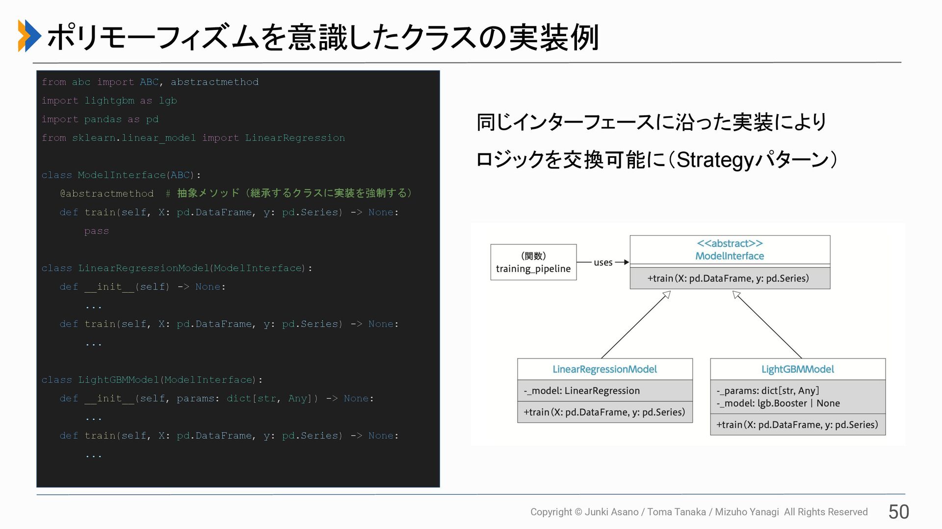 All Rights Reserved from abc import ABC, abstractmethod import lightgbm as lgb import pandas as pd from sklearn.linear_model import LinearRegression class ModelInterface(ABC): @abstractmethod # 抽象メソッド(継承するクラスに実装を強制する) def train(self, X: pd.DataFrame, y: pd.Series) -> None: pass class LinearRegressionModel(ModelInterface): def __init__(self) -> None: ... def train(self, X: pd.DataFrame, y: pd.Series) -> None: ... class LightGBMModel(ModelInterface): def __init__(self, params: dict[str, Any]) -> None: ... def train(self, X: pd.DataFrame, y: pd.Series) -> None: ... 50 ポリモーフィズムを意識したクラスの実装例 同じインターフェースに沿った実装により ロジックを交換可能に(Strategyパターン)