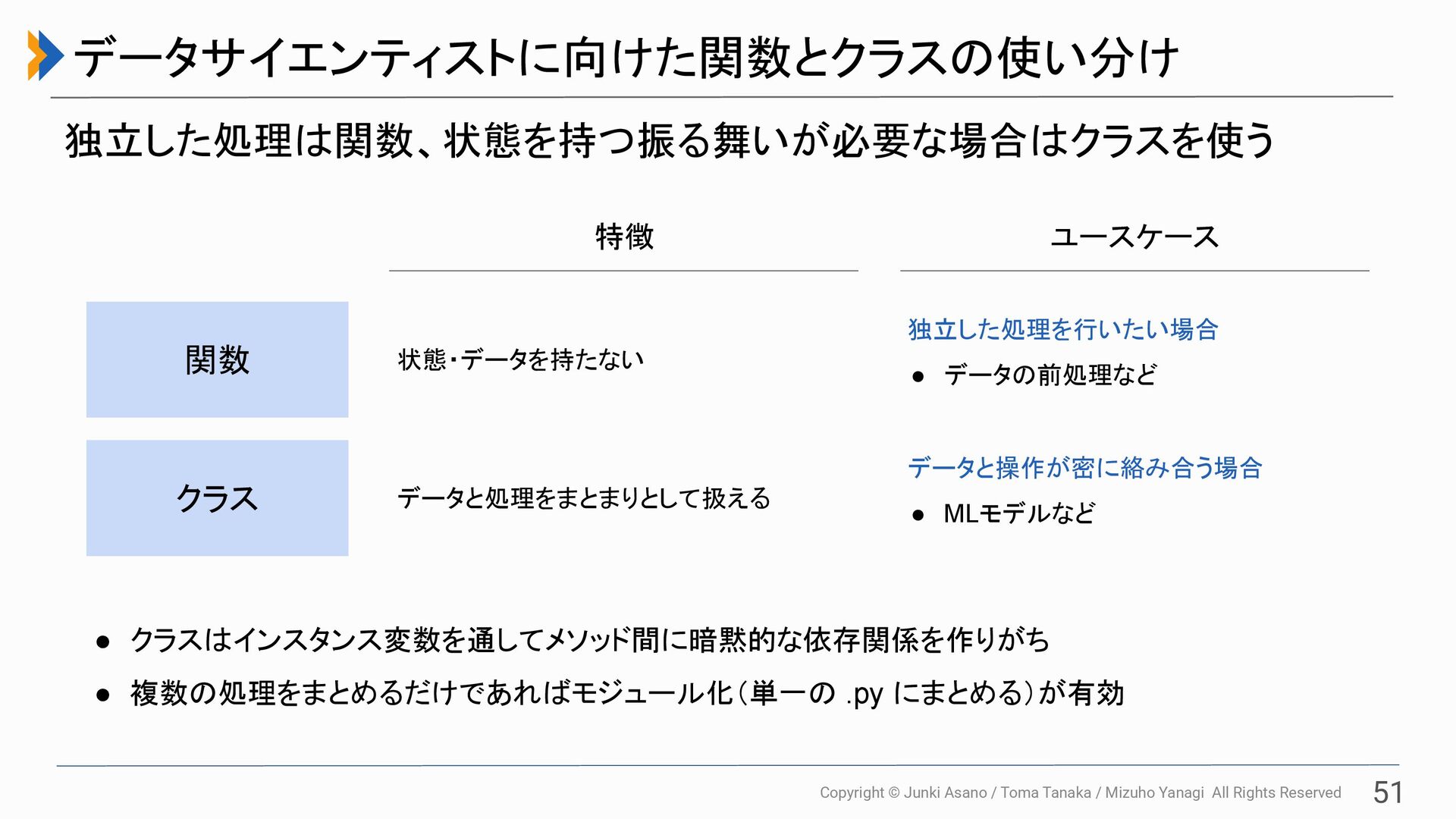All Rights Reserved 51 データサイエンティストに向けた関数とクラスの使い分け 独立した処理は関数、状態を持つ振る舞いが必要な場合はクラスを使う 特徴 ユースケース 関数 状態・データを持たない 独立した処理を行いたい場合 • データの前処理など クラス データと処理をまとまりとして扱える データと操作が密に絡み合う場合 • MLモデルなど • クラスはインスタンス変数を通してメソッド間に暗黙的な依存関係を作りがち • 複数の処理をまとめるだけであればモジュール化(単一の .py にまとめる)が有効