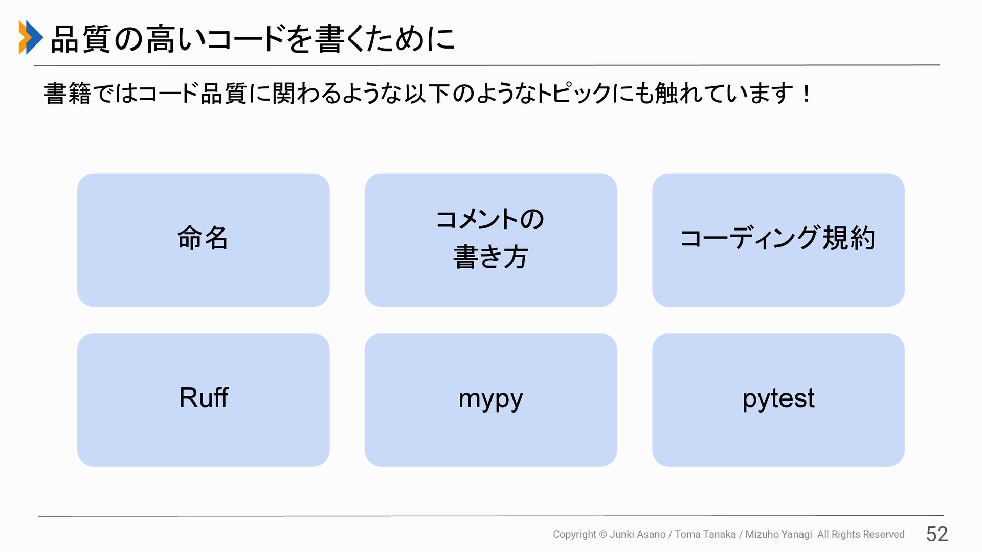 All Rights Reserved 52 品質の高いコードを書くために 書籍ではコード品質に関わるような以下のようなトピックにも触れています! 命名 コメントの 書き方 コーディング規約 Ruff mypy pytest