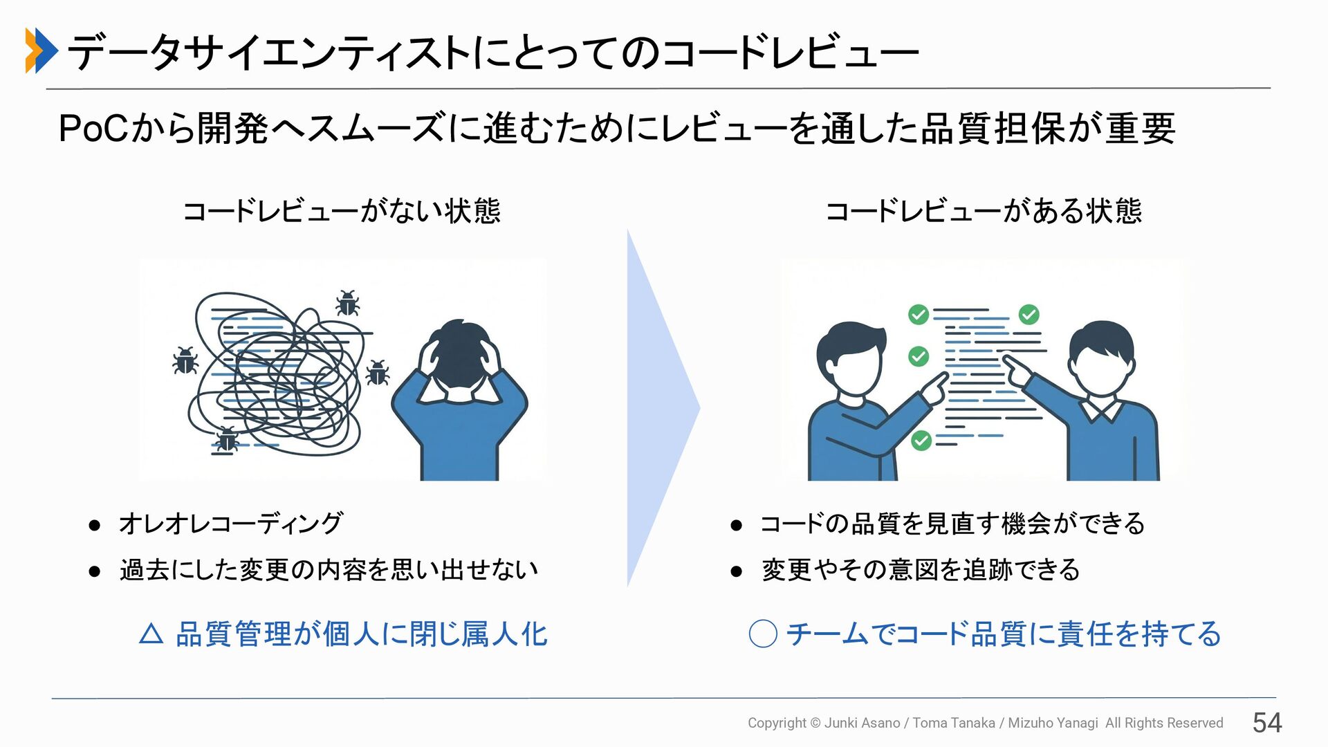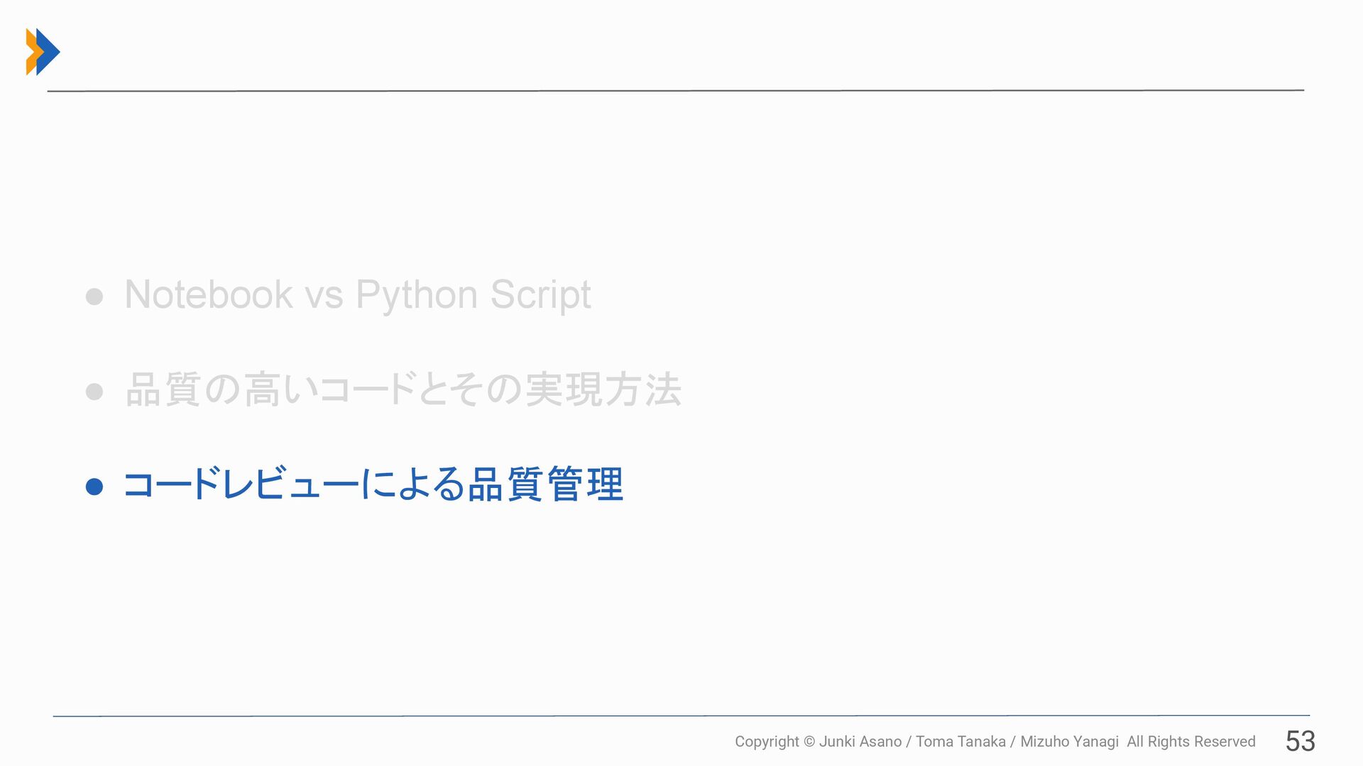 All Rights Reserved 53 • Notebook vs Python Script • 品質の高いコードとその実現方法 • コードレビューによる品質管理
