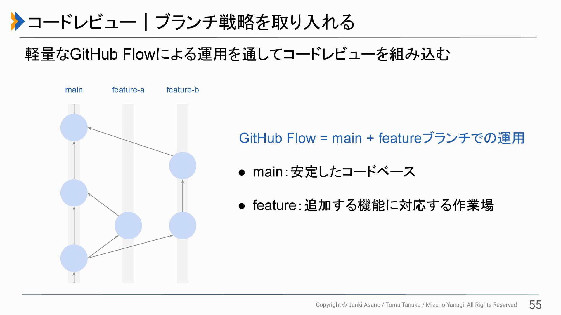 All Rights Reserved 55 コードレビュー|ブランチ戦略を取り入れる 軽量なGitHub Flowによる運用を通してコードレビューを組み込む GitHub Flow = main + featureブランチでの運用 • main:安定したコードベース • feature:追加する機能に対応する作業場 feature-a feature-b main