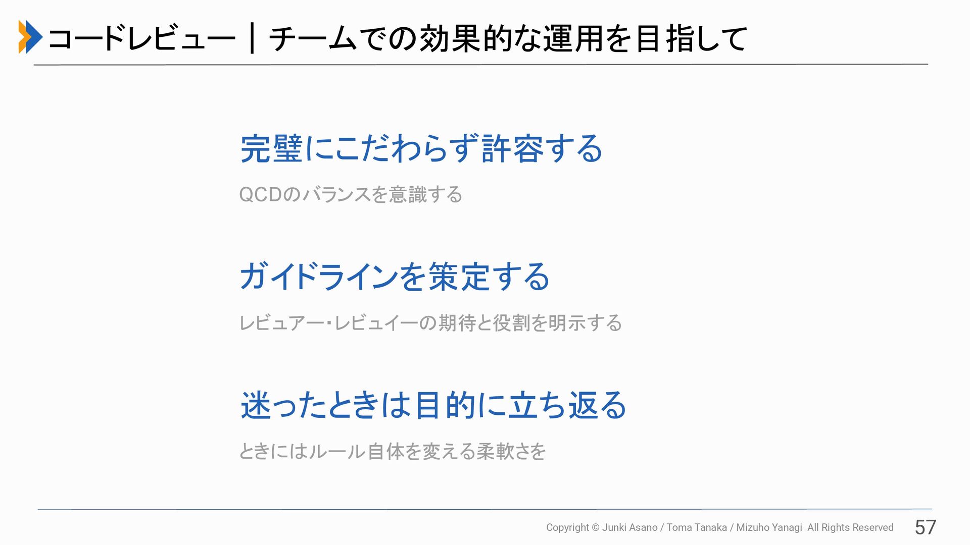 All Rights Reserved 56 コードレビュー|レビューの心得 自分のコードには自分が責任を持つ テストなどによりロジックの正確さは自身で担保 コミット・PRの意図を明確化する 適切な粒度、コミットメッセージ レビュアーへの要望の明示する PRテンプレート機能の活用 レビュイーの心得 レビューコメントの意図を明確化する prefixによる要求の明示(MUST / IMOなど) ポジティブなフィードバックもする レビューは賞賛の場でもある レビュー以外の選択肢も持つ 輪読会やペアプロを通したスキルの土台づくり レビュアーの心得 レビュイー・レビュアーの双方が自身の役割を理解することが重要
