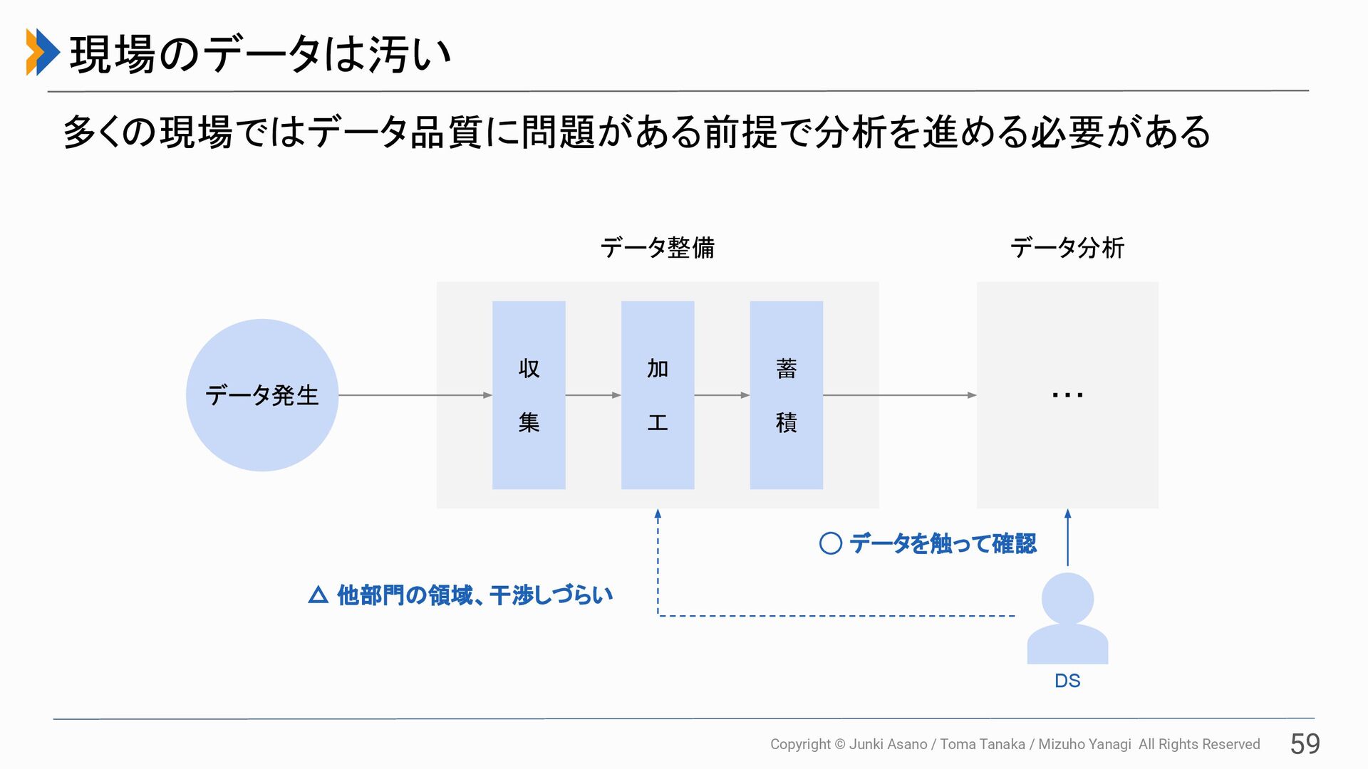 All Rights Reserved 現場のデータは汚い 60 多くの現場ではデータ品質に問題がある前提で分析を進める必要がある ・・・ 収 集 加 工 蓄 積 データ発生 データ整備 データ分析 △ 他部門の領域、干渉しづらい ◯ データを触って確認 DS Controllable