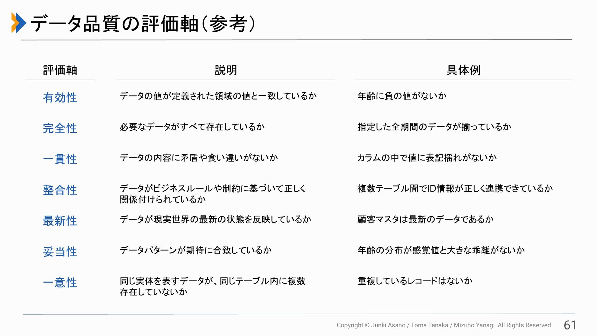 All Rights Reserved 61 データ品質の評価軸(参考) 評価軸 説明 具体例 有効性 データの値が定義された領域の値と一致しているか 年齢に負の値がないか 完全性 必要なデータがすべて存在しているか 指定した全期間のデータが揃っているか 一貫性 データの内容に矛盾や食い違いがないか カラムの中で値に表記揺れがないか 整合性 データがビジネスルールや制約に基づいて正しく 関係付けられているか 複数テーブル間でID情報が正しく連携できているか 最新性 データが現実世界の最新の状態を反映しているか 顧客マスタは最新のデータであるか 妥当性 データパターンが期待に合致しているか 年齢の分布が感覚値と大きな乖離がないか 一意性 同じ実体を表すデータが、同じテーブル内に複数 存在していないか 重複しているレコードはないか