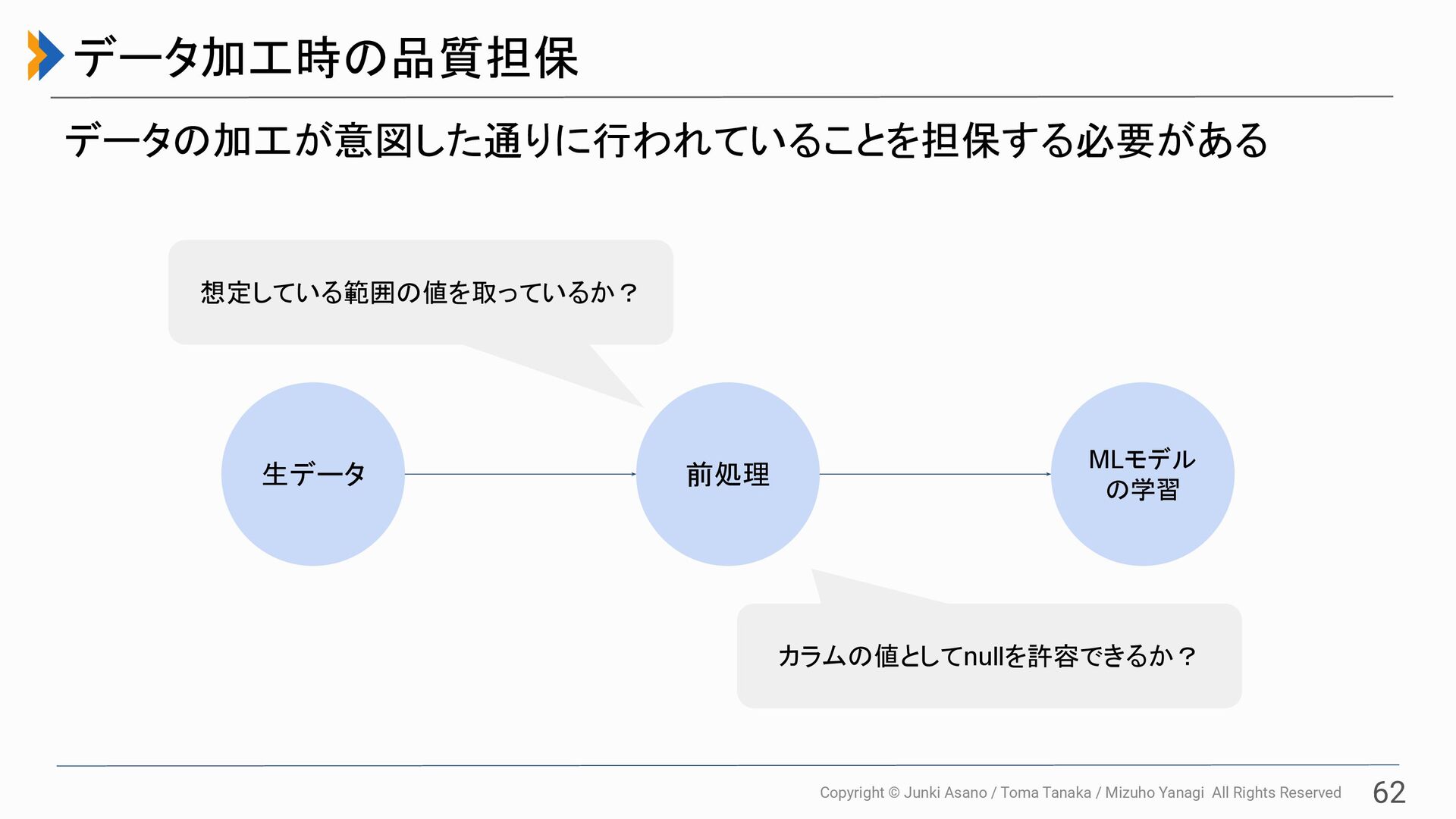 All Rights Reserved 62 データ加工時の品質担保 データの加工が意図した通りに行われていることを担保する必要がある 生データ 前処理 MLモデル の学習 カラムの値としてnullを許容できるか? 想定している範囲の値を取っているか?