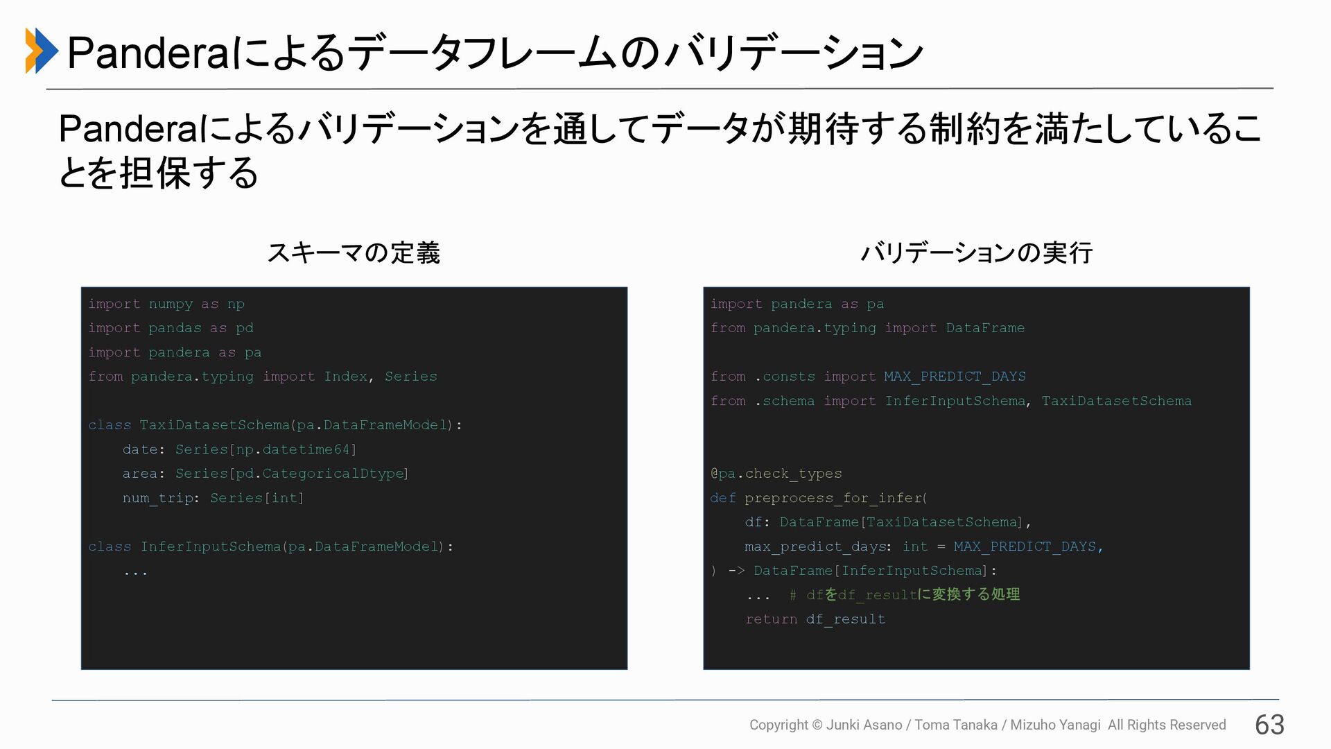 All Rights Reserved 63 Panderaによるデータフレームのバリデーション Panderaによるバリデーションを通してデータが期待する制約を満たしているこ とを担保する import pandera as pa from pandera.typing import DataFrame from .consts import MAX_PREDICT_DAYS from .schema import InferInputSchema, TaxiDatasetSchema @pa.check_types def preprocess_for_infer( df: DataFrame[TaxiDatasetSchema], max_predict_days: int = MAX_PREDICT_DAYS, ) -> DataFrame[InferInputSchema]: ... # dfをdf_resultに変換する処理 return df_result バリデーションの実行 import numpy as np import pandas as pd import pandera as pa from pandera.typing import Index, Series class TaxiDatasetSchema(pa.DataFrameModel): date: Series[np.datetime64] area: Series[pd.CategoricalDtype] num_trip: Series[int] class InferInputSchema(pa.DataFrameModel): ... スキーマの定義