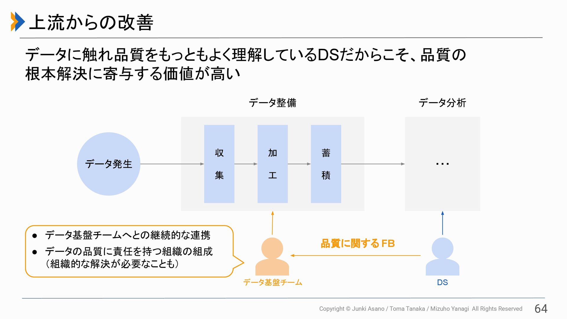 All Rights Reserved 64 上流からの改善 データに触れ品質をもっともよく理解しているDSだからこそ、品質の 根本解決に寄与する価値が高い ・・・ 収 集 加 工 蓄 積 データ発生 データ整備 データ分析 DS データ基盤チーム 品質に関する FB • データ基盤チームへとの継続的な連携 • データの品質に責任を持つ組織の組成 (組織的な解決が必要なことも)