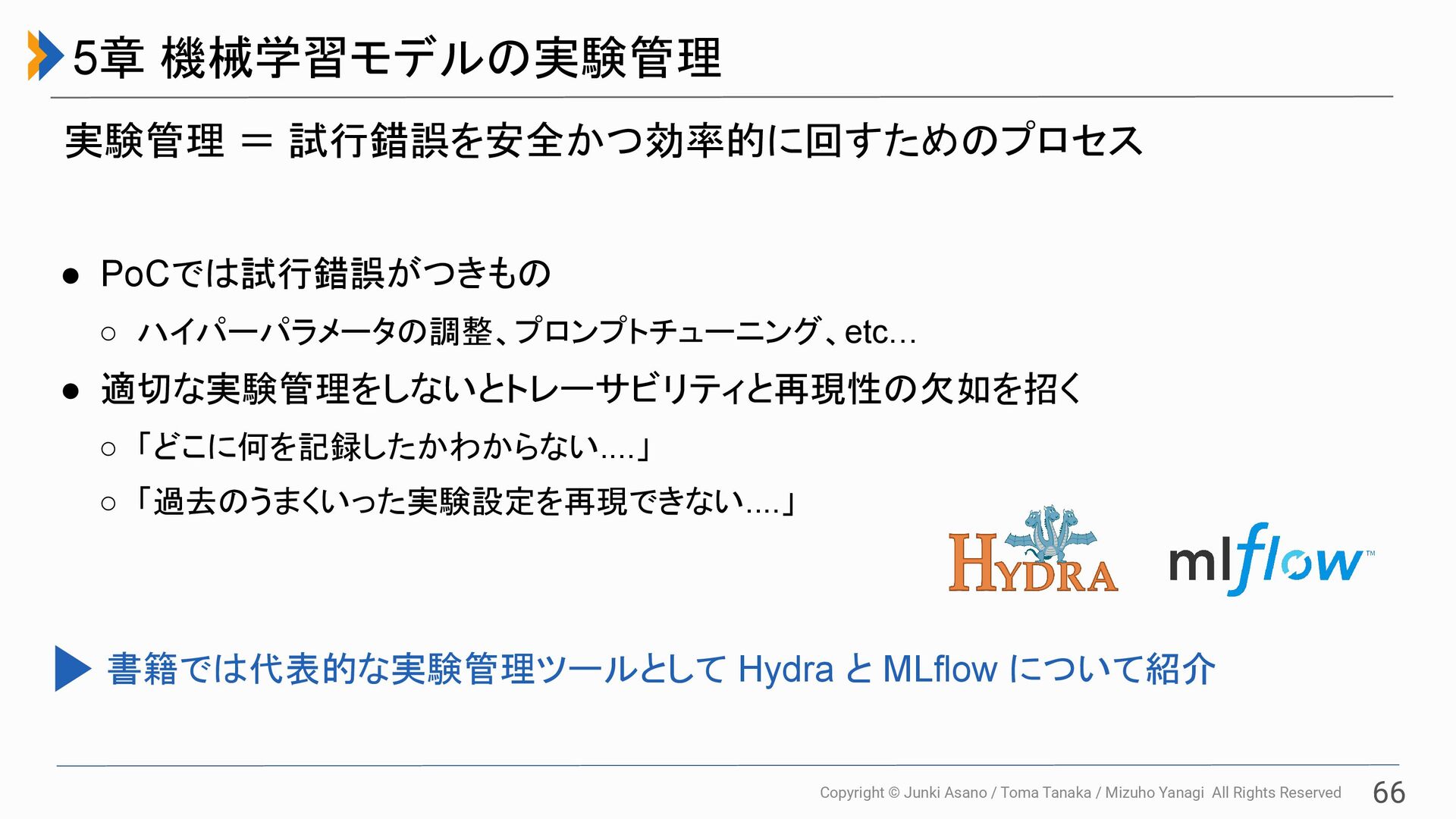 All Rights Reserved 66 5章 機械学習モデルの実験管理 実験管理 = 試行錯誤を安全かつ効率的に回すためのプロセス • PoCでは試行錯誤がつきもの ◦ ハイパーパラメータの調整、プロンプトチューニング、etc… • 適切な実験管理をしないとトレーサビリティと再現性の欠如を招く ◦ 「どこに何を記録したかわからない....」 ◦ 「過去のうまくいった実験設定を再現できない....」 書籍では代表的な実験管理ツールとして Hydra と MLflow について紹介