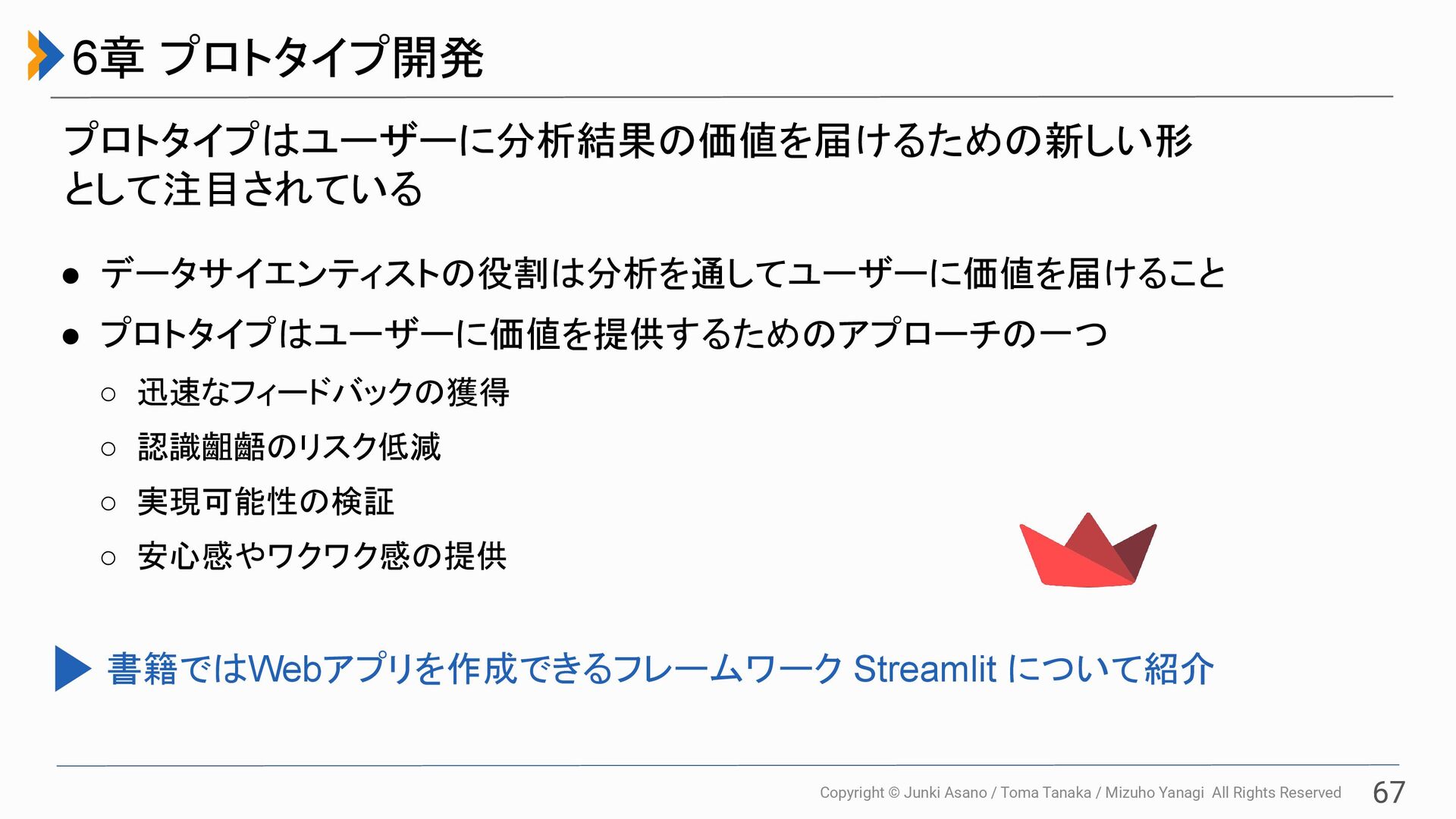 All Rights Reserved 67 6章 プロトタイプ開発 • データサイエンティストの役割は分析を通してユーザーに価値を届けること • プロトタイプはユーザーに価値を提供するためのアプローチの一つ ◦ 迅速なフィードバックの獲得 ◦ 認識齟齬のリスク低減 ◦ 実現可能性の検証 ◦ 安心感やワクワク感の提供 プロトタイプはユーザーに分析結果の価値を届けるための新しい形 として注目されている 書籍ではWebアプリを作成できるフレームワーク Streamlit について紹介