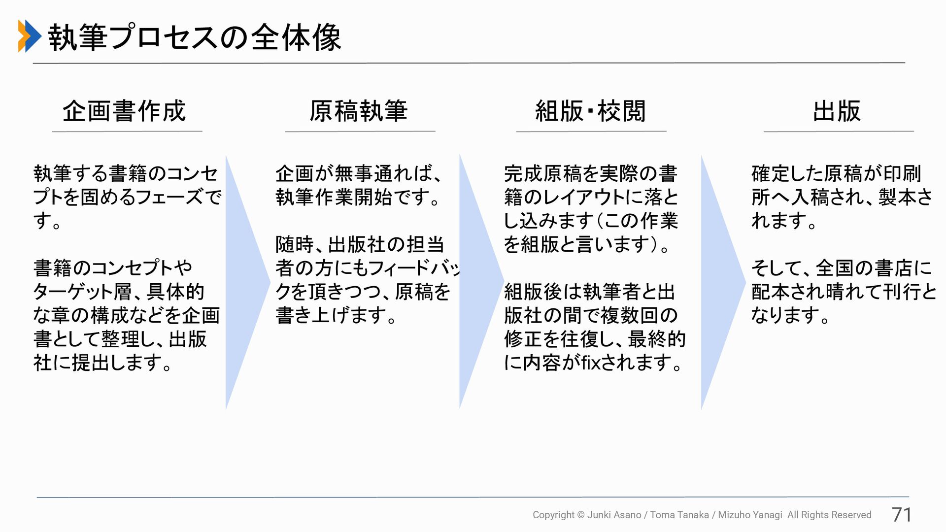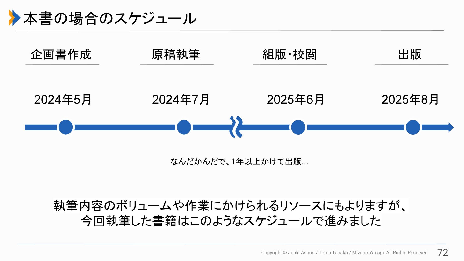 All Rights Reserved 71 執筆プロセスの全体像 企画書作成 原稿執筆 組版・校閲 出版 執筆する書籍のコンセ プトを固めるフェーズで す。 書籍のコンセプトや ターゲット層、具体的 な章の構成などを企画 書として整理し、出版 社に提出します。 企画が無事通れば、 執筆作業開始です。 随時、出版社の担当 者の方にもフィードバッ クを頂きつつ、原稿を 書き上げます。 完成原稿を実際の書 籍のレイアウトに落と し込みます(この作業 を組版と言います)。 組版後は執筆者と出 版社の間で複数回の 修正を往復し、最終的 に内容がfixされます。 確定した原稿が印刷 所へ入稿され、製本さ れます。 そして、全国の書店に 配本され晴れて刊行と なります。