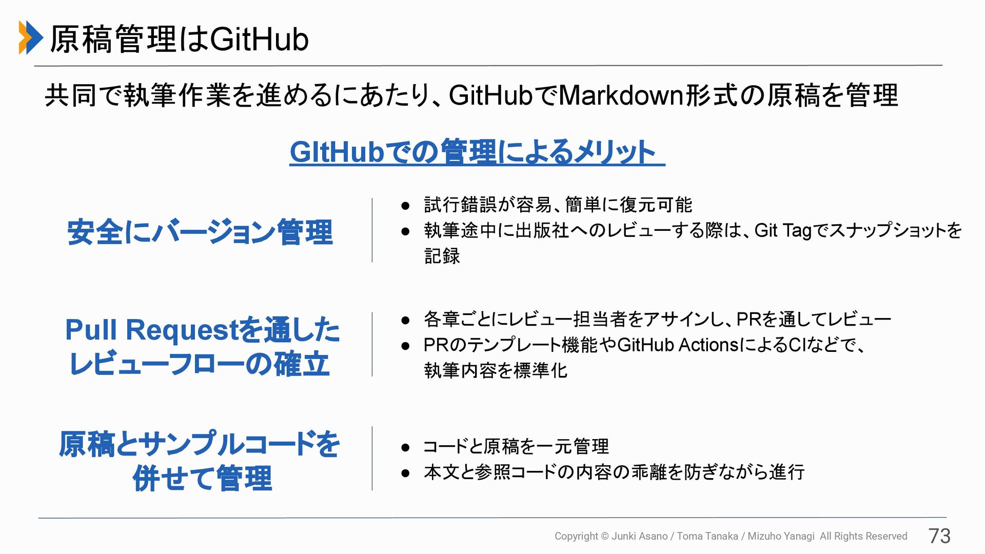 All Rights Reserved 73 原稿管理はGitHub 共同で執筆作業を進めるにあたり、GitHubでMarkdown形式の原稿を管理 安全にバージョン管理 • 試行錯誤が容易、簡単に復元可能 • 執筆途中に出版社へのレビューする際は、Git Tagでスナップショットを 記録 Pull Requestを通した レビューフローの確立 • 各章ごとにレビュー担当者をアサインし、PRを通してレビュー • PRのテンプレート機能やGitHub ActionsによるCIなどで、 執筆内容を標準化 原稿とサンプルコードを 併せて管理 • コードと原稿を一元管理 • 本文と参照コードの内容の乖離を防ぎながら進行 GItHubでの管理によるメリット