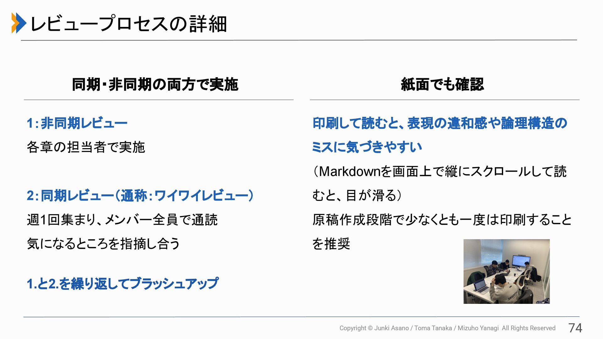All Rights Reserved 74 レビュープロセスの詳細 1:非同期レビュー 各章の担当者で実施 2:同期レビュー(通称:ワイワイレビュー) 週1回集まり、メンバー全員で通読 気になるところを指摘し合う   1.と2.を繰り返してブラッシュアップ 同期・非同期の両方で実施 印刷して読むと、表現の違和感や論理構造の ミスに気づきやすい (Markdownを画面上で縦にスクロールして読 むと、目が滑る) 原稿作成段階で少なくとも一度は印刷すること を推奨 紙面でも確認