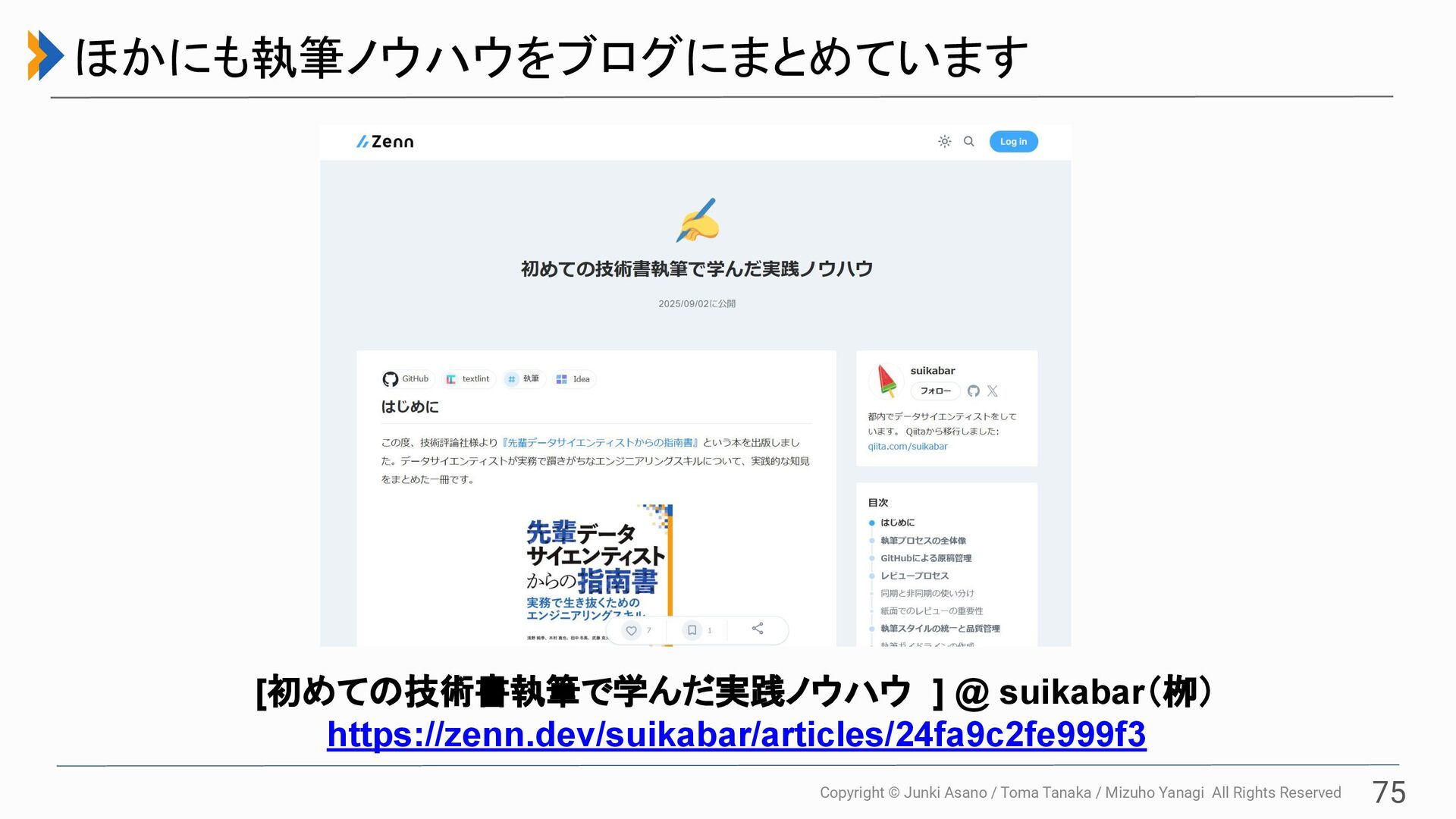 All Rights Reserved 75 ほかにも執筆ノウハウをブログにまとめています [初めての技術書執筆で学んだ実践ノウハウ ] @ suikabar(栁) https://zenn.dev/suikabar/articles/24fa9c2fe999f3