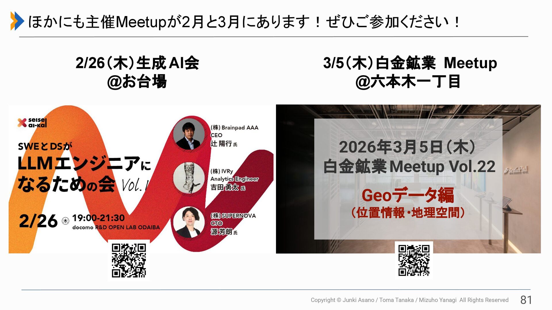 All Rights Reserved 81 ほかにも主催Meetupが2月と3月にあります!ぜひご参加ください! 2026年3月5日(木) 白金鉱業Meetup Vol.22   Geoデータ編 (位置情報 •地理空間) 2/26(木)生成 AI会 @お台場 3/5(木)白金鉱業 Meetup @六本木一丁目