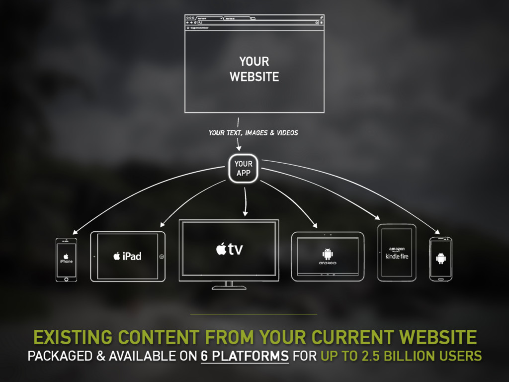 Did you know that your existing Website or Blog can easily be turned into a Mobile, Tablet and Apple TV app? In the multi-device world we now live in, where 2.5 billion people are actively using iPhone, iPad and Android apps each month - having "just a website" is no longer enough for a business to effectively reach their audience.