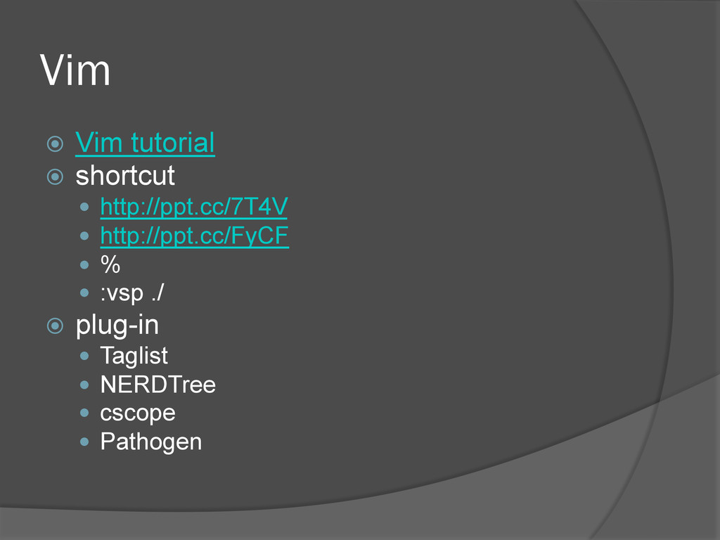 http://ppt.cc/FyCF % :vsp ./ plug-in Taglist NERDTree cscope Pathogen