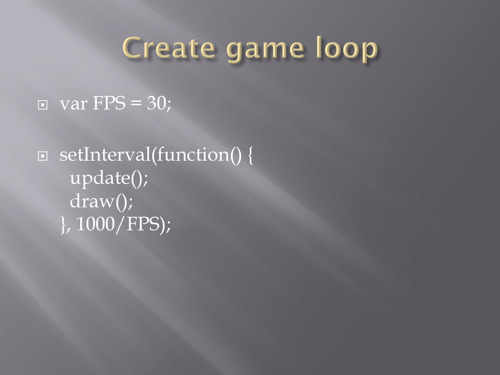 ¨ var FPS = 30; ¨ setInterval(function() { update(); draw();