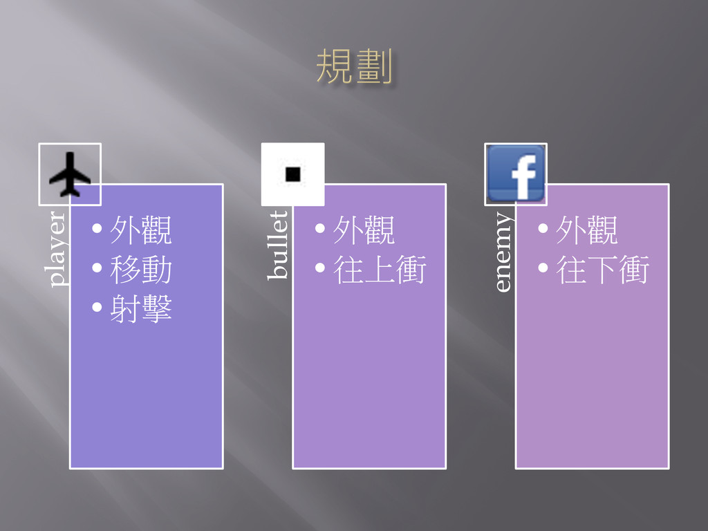 player • 外觀 • 移動 • 射擊 bullet • 外觀 • 往上衝 enemy • 外觀 • 往下衝