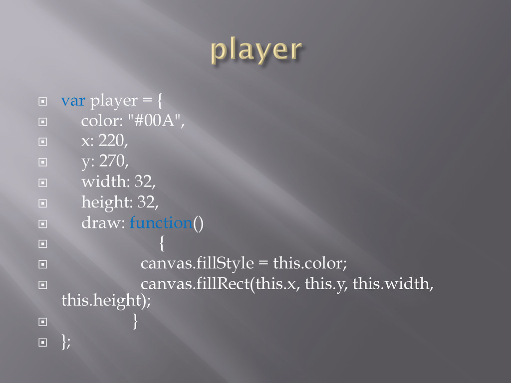 220, ¨ y: 270, ¨ width: 32, ¨ height: 32, ¨ draw: function() ¨ { ¨ canvas.fillStyle = this.color; ¨ canvas.fillRect(this.x, this.y, this.width, this.height); ¨ } ¨ };