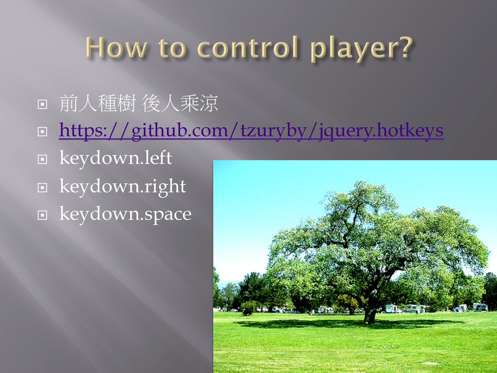 ¨ 前人種樹 後人乘涼 ¨ https://github.com/tzuryby/jquery.hotkeys ¨ keydown.left ¨ keydown.right ¨