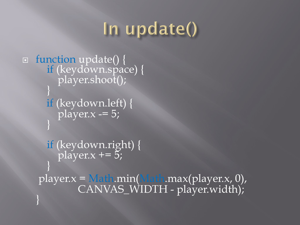(keydown.left) { player.x -= 5; } if (keydown.right) { player.x += 5; } player.x = Math.min(Math.max(player.x, 0), CANVAS_WIDTH - player.width); }