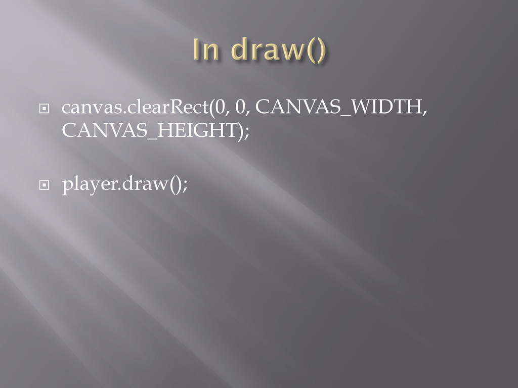 ¨ canvas.clearRect(0, 0, CANVAS_WIDTH, CANVAS_HEIGHT); ¨ player.draw();
