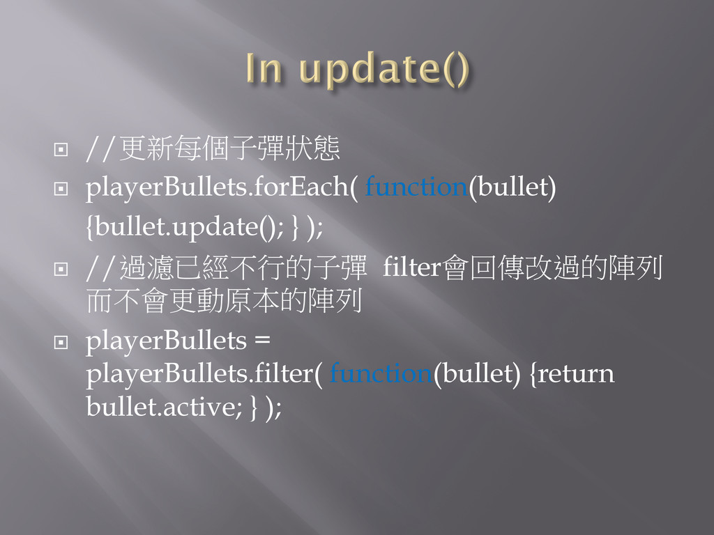 ¨ //更新每個子彈狀態 ¨ playerBullets.forEach( function(bullet) {bullet.update(); } ); ¨ //過濾已經不行的子彈
