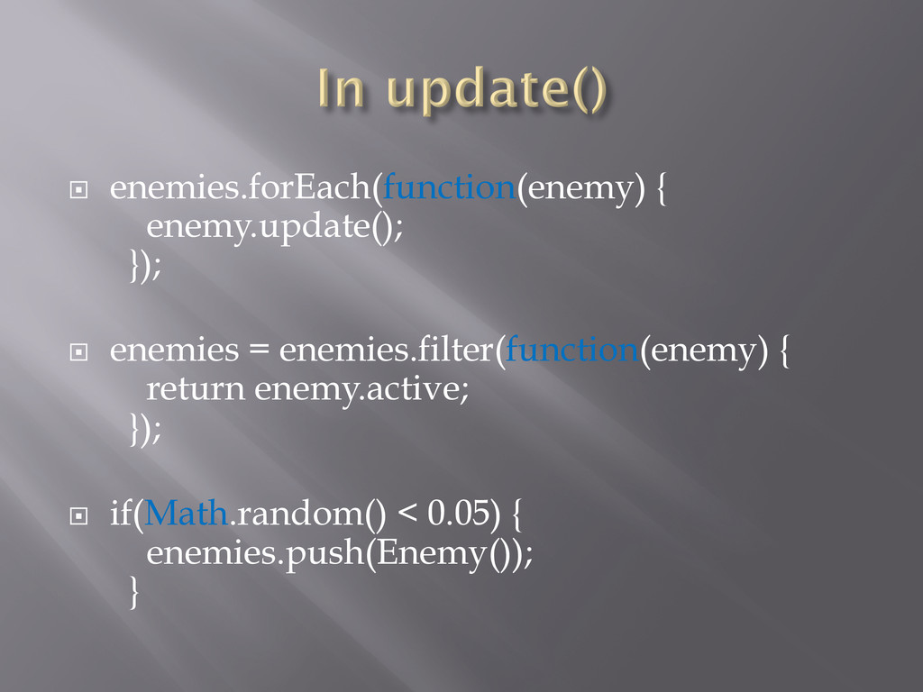 ¨ enemies.forEach(function(enemy) { enemy.update(); }); ¨ enemies = enemies.filter(function(enemy) {