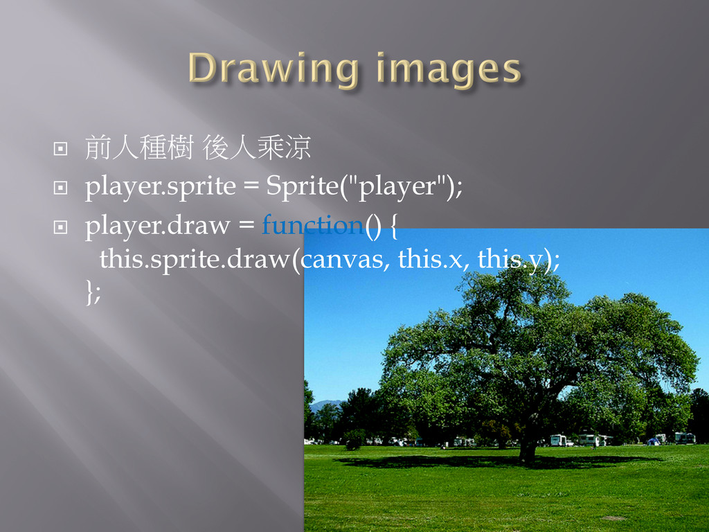 ¨ 前人種樹 後人乘涼 ¨ player.sprite = Sprite("player"); ¨ player.draw =