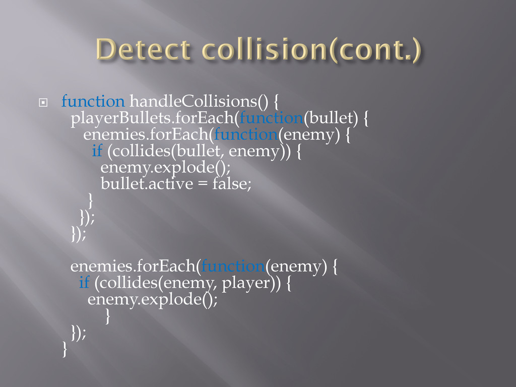 ¨ function handleCollisions() { playerBullets.forEach(function(bullet) { enemies.forEach(function(enemy) { if (collides(bullet,