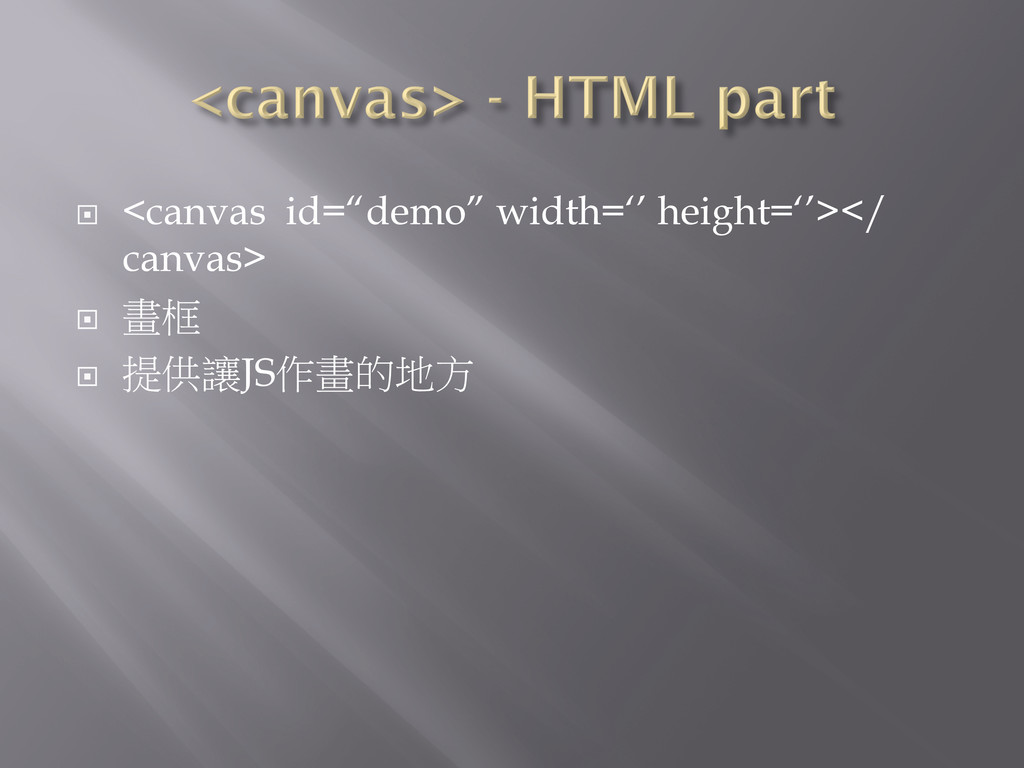 ¨ <canvas id=“demo” width=‘’ height=‘’></ canvas> ¨ 畫框 ¨ 提供讓JS作畫的地方