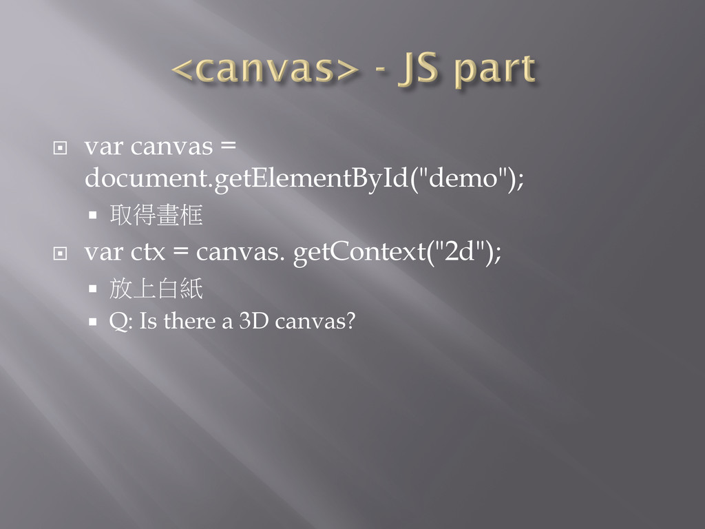 = canvas. getContext("2d"); ¡ 放上白紙 ¡ Q: Is there a 3D canvas?