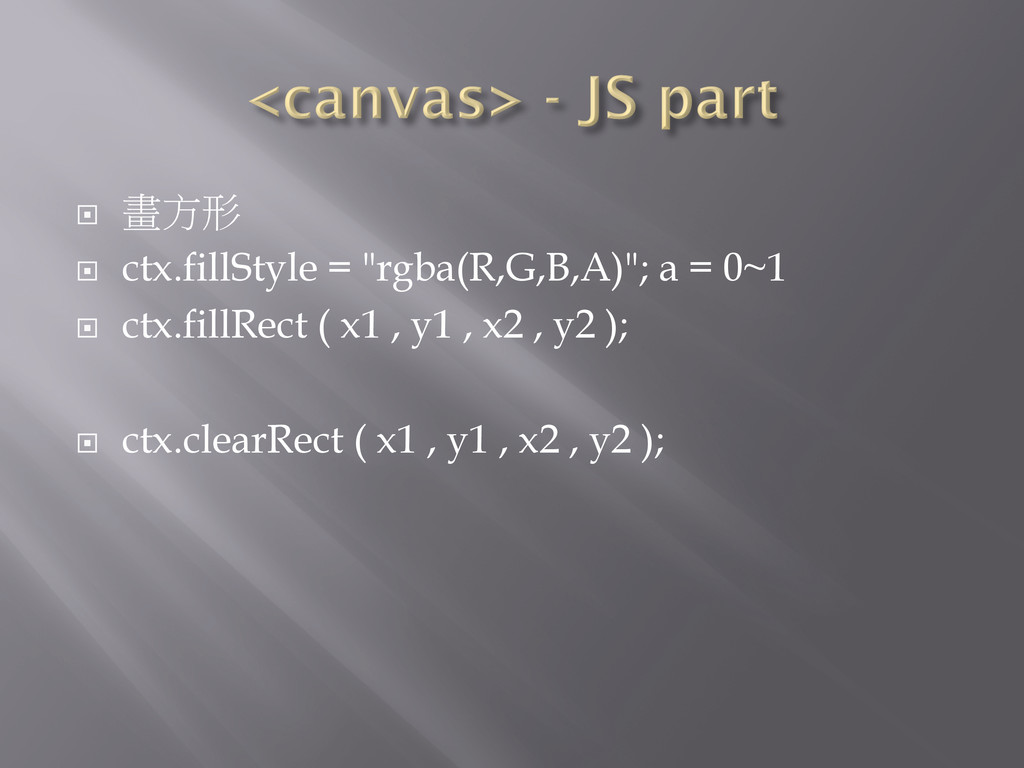 //從目前位置畫到某一點 ¨ ctx.lineTo(10,50); ¨ ctx.closePath(); //將目前的點與原點連接起來 ¨ ctx.stroke(); //描外框 ¨ ctx.fillStyle = "rgb(R,G,B)"; //0~255 ¨ ctx.fill(); //填滿(自動執行 closePath())