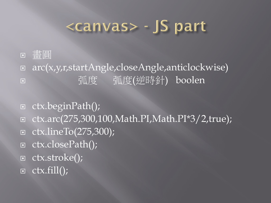 ¨ 畫圓 ¨ arc(x,y,r,startAngle,closeAngle,anticlockwise) ¨ 弧度 弧度(逆時針) boolen ¨ ctx.beginPath();