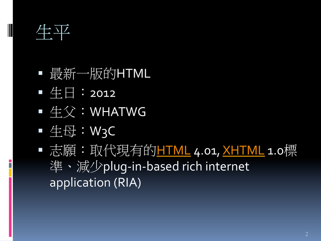 § 生母:W3C § 志願:取代現有的 HTML 4.01, XHTML 1.0標 準、減少plug-‐in-‐based rich internet application (RIA) 2