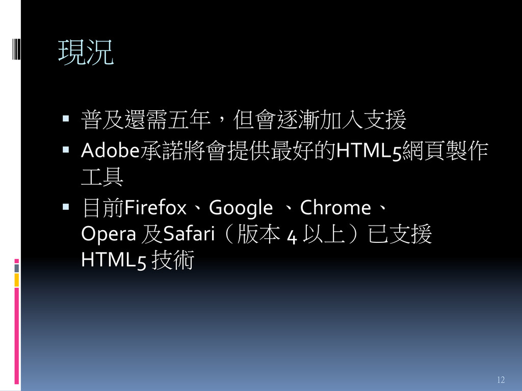 現況 § 普及還需五年,但會逐漸加入支援 § Adobe承諾將會提供最好的HTML5網頁製作 工具 § 目前 Firefox、Google
