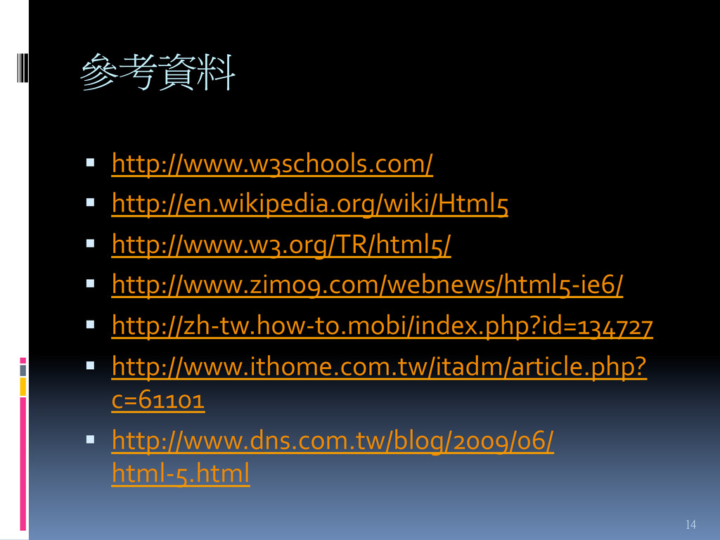 § http://www.zimo9.com/webnews/html5-‐ie6/ § http://zh-‐tw.how-‐to.mobi/index.php?id=134727 § http://www.ithome.com.tw/itadm/article.php? c=61101 § http://www.dns.com.tw/blog/2009/06/ html-‐5.html 14